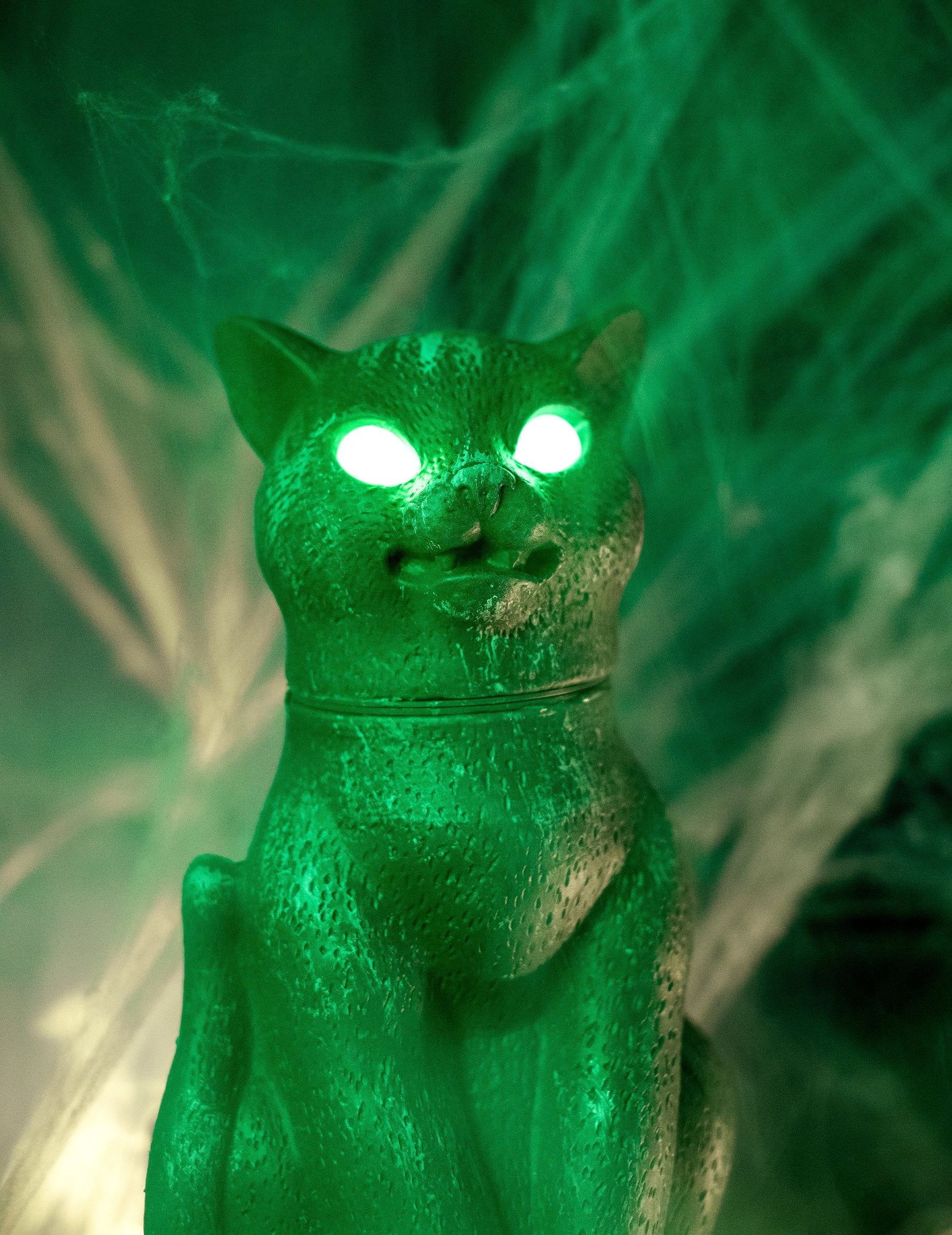 Ez a hang- és élénk fekete macska körülbelül 30 cm magas. Csak be kell kapcsolnod, hogy a feje megforduljon, és a szeme zöld színű. A még ijesztőbb oldal érdekében ez a macska üvöltést nyom. Ez a dekoráció 3 AA akkumulátorral működik. Ez a fekete macska tökéletes lesz a félelmetes dekoráció befejezéséhez a Halloween estéjén!