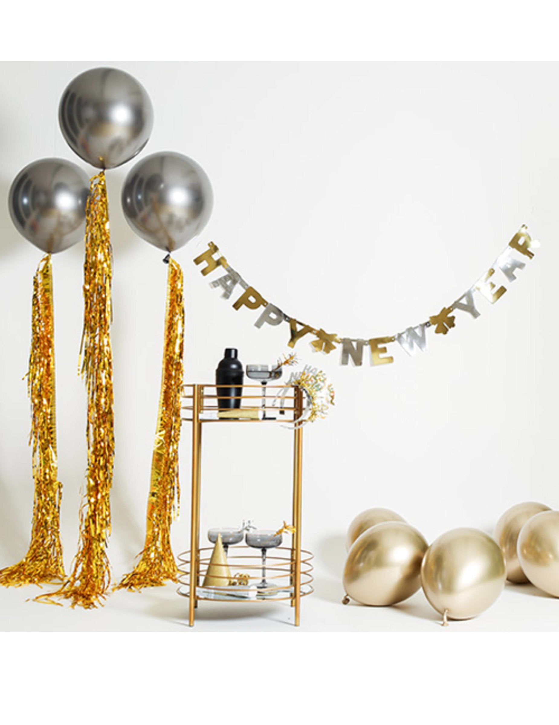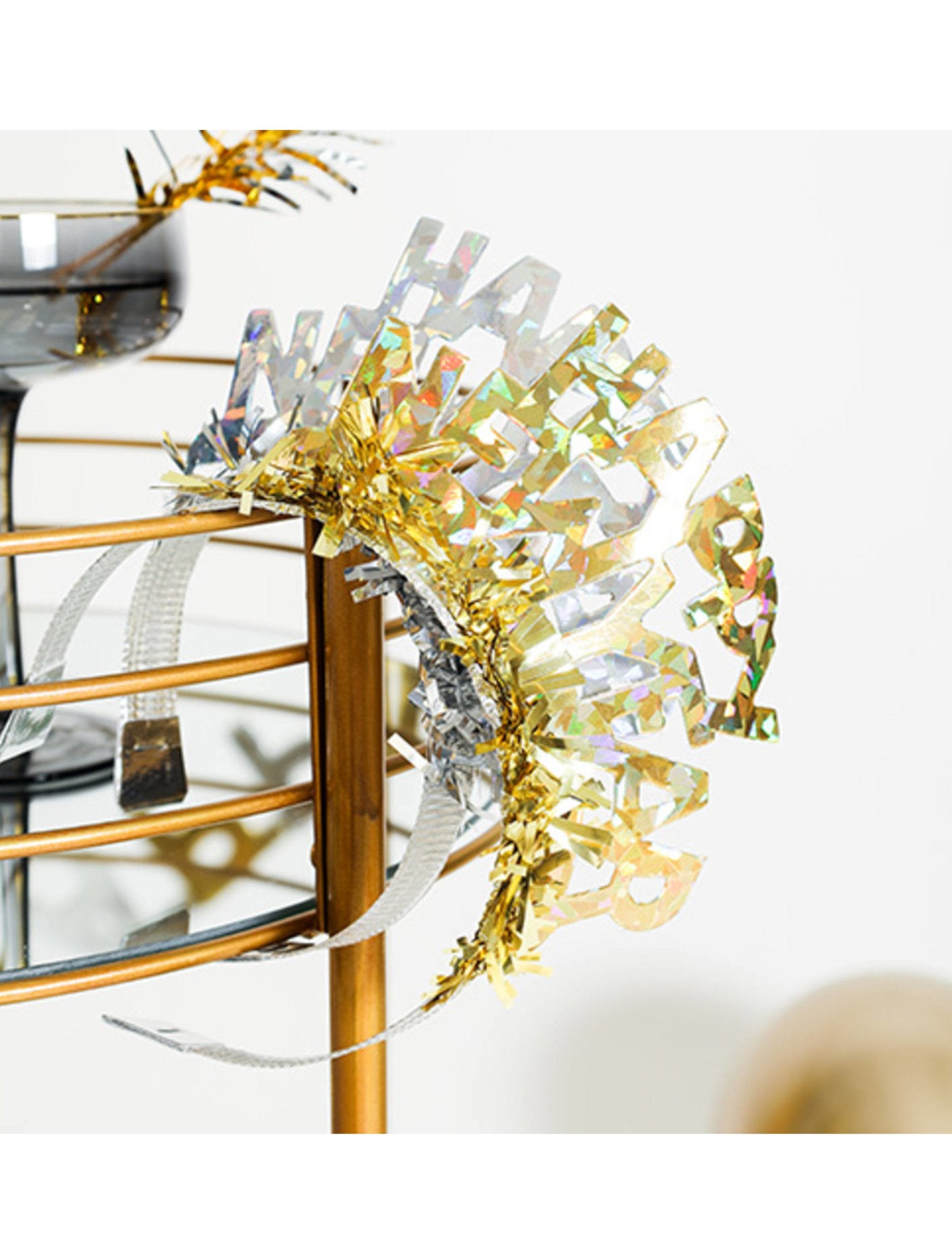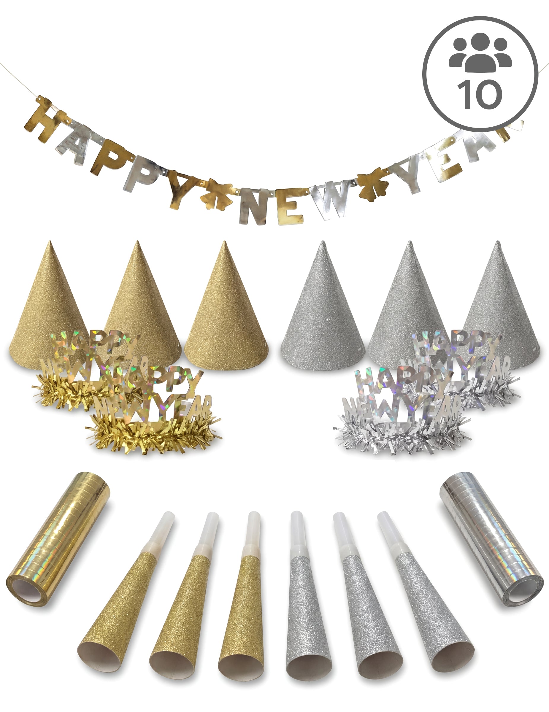 Ez az arany- és ezüst faktorkészlet 27 darabot tartalmaz. Tartalmazza: 6 tiara, 6 szarv, 6 kalap, 6 maszk, 2 szerpentin és 1 zászló. Kiválóan alkalmas új évet a barátokkal vagy a családdal való megünneplésre!