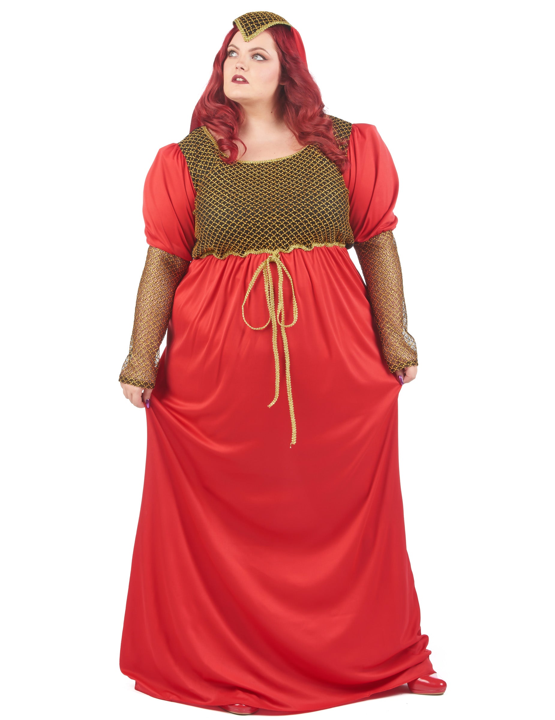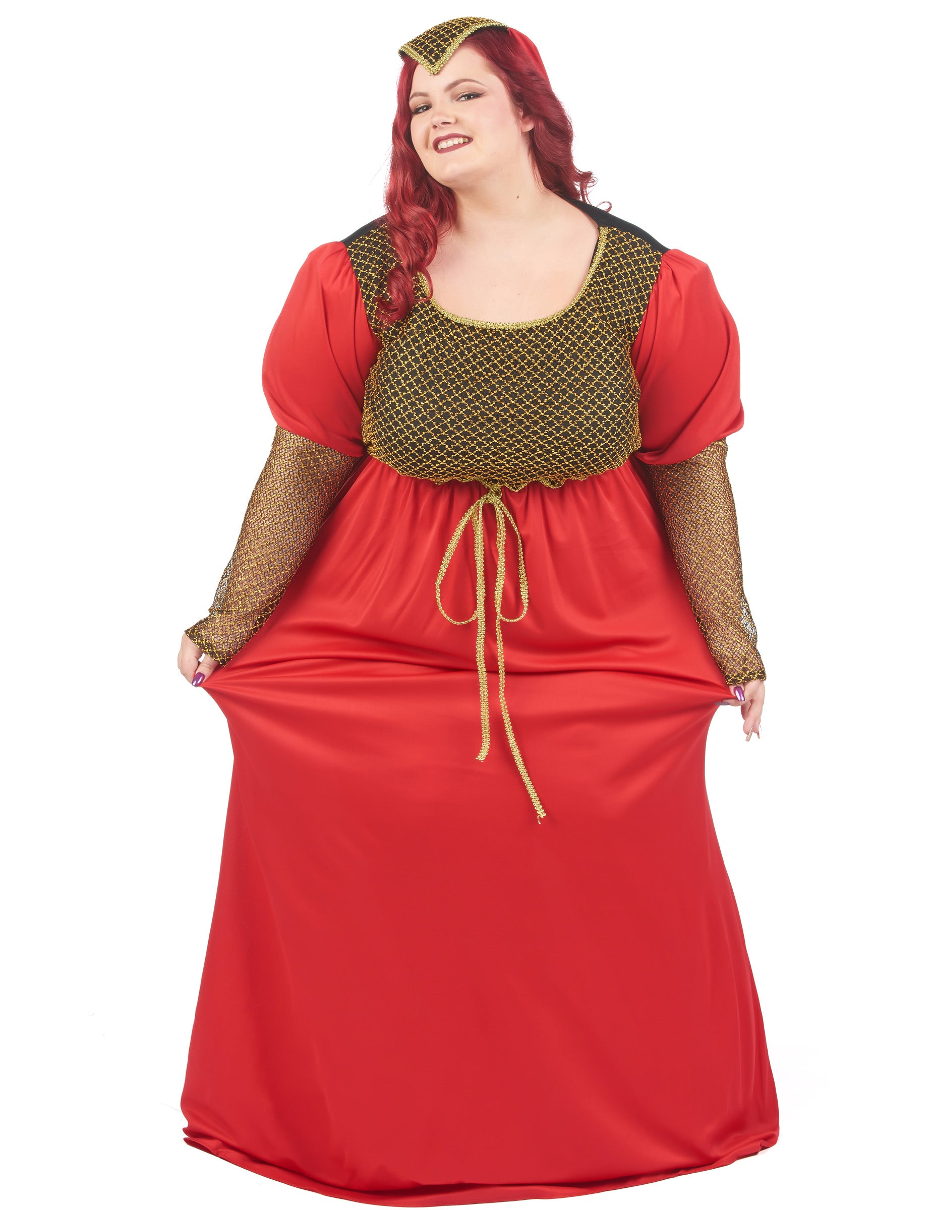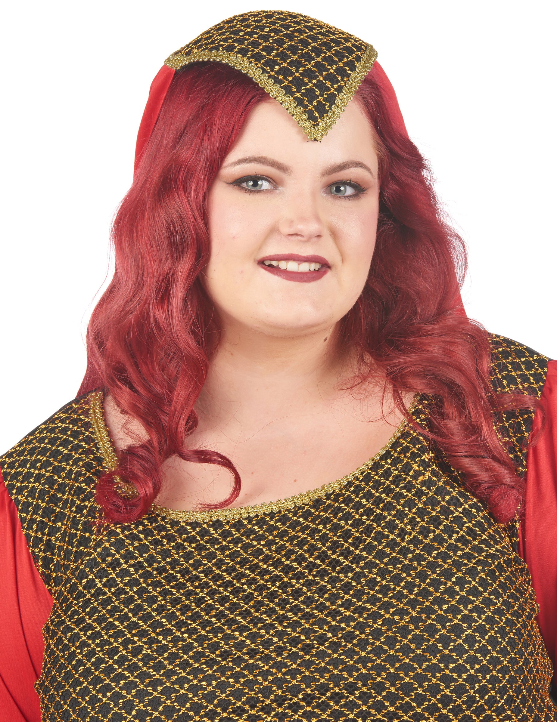 Ez Nagy méretű piros középkori jelmez erre való nőkEgy ruhából és egy fejdíszből áll.
