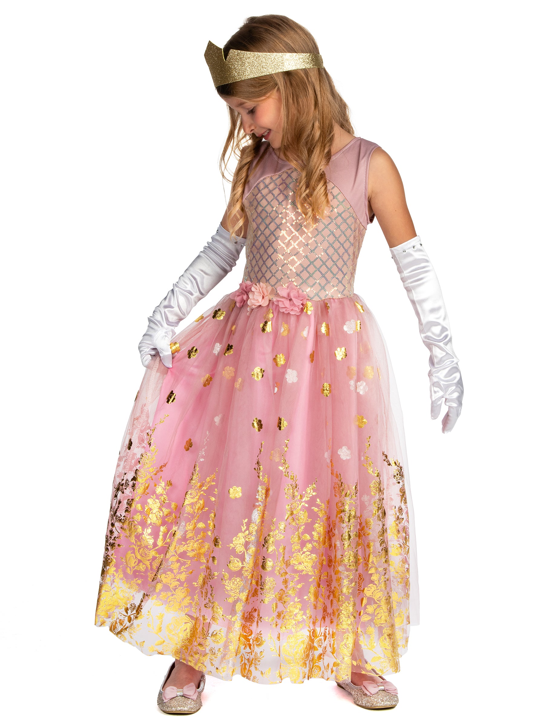 Ez rozéarany hercegnő jelmez erre való lányTartalmaz egy ruhát és egy koronát.