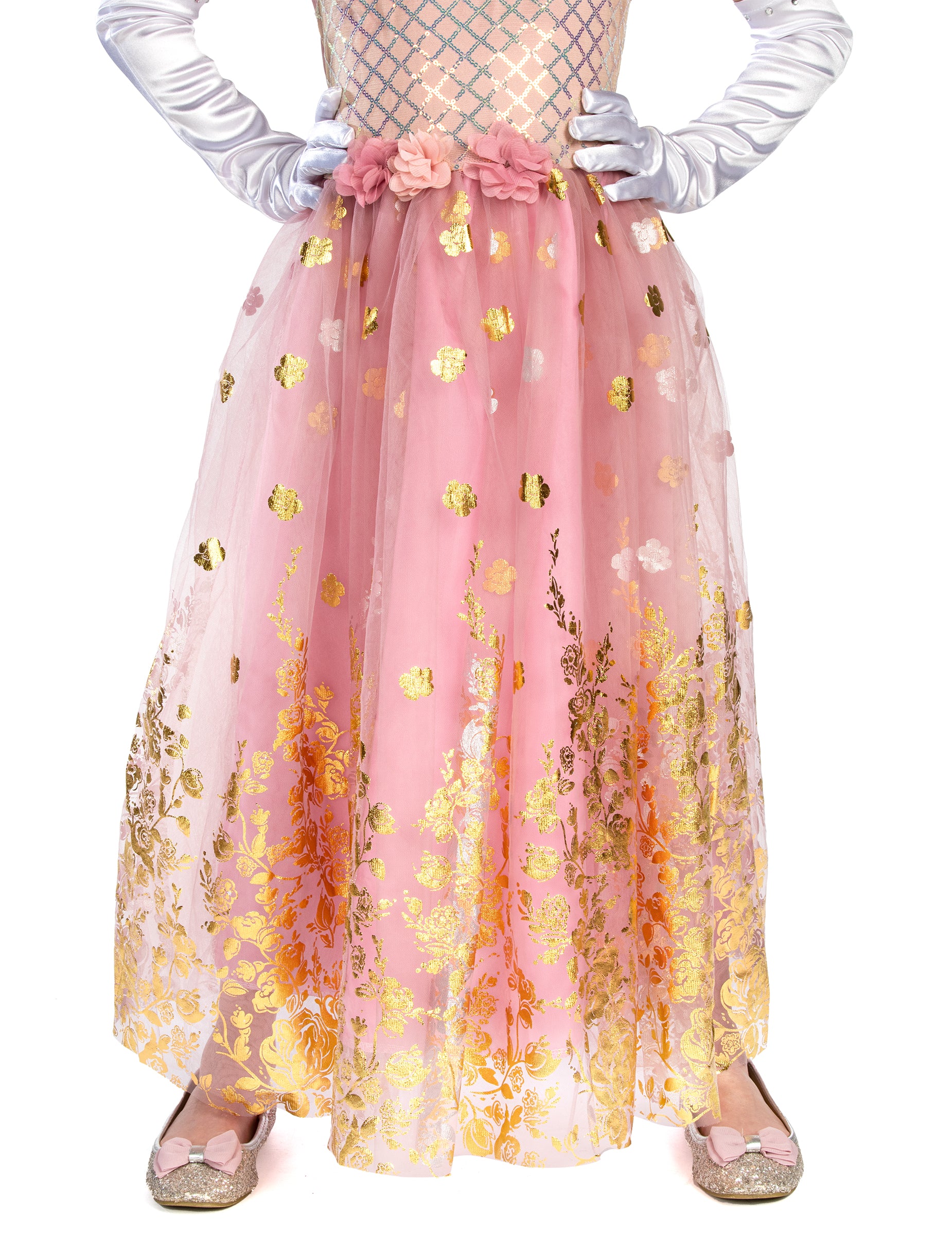 A jelmez ruhája hosszú és ujjatlan. Színes. rózsaszín összességében, számos kíséretében arany minták (virágok).