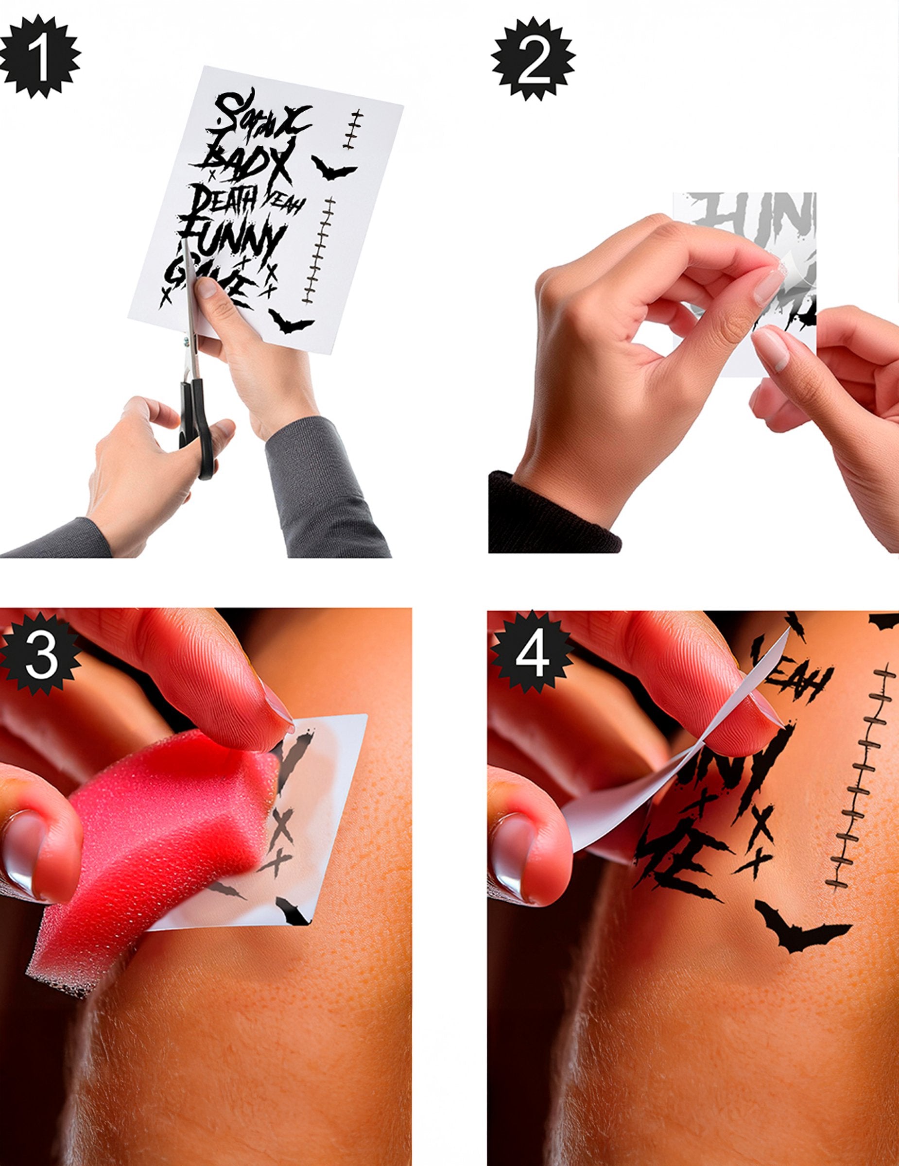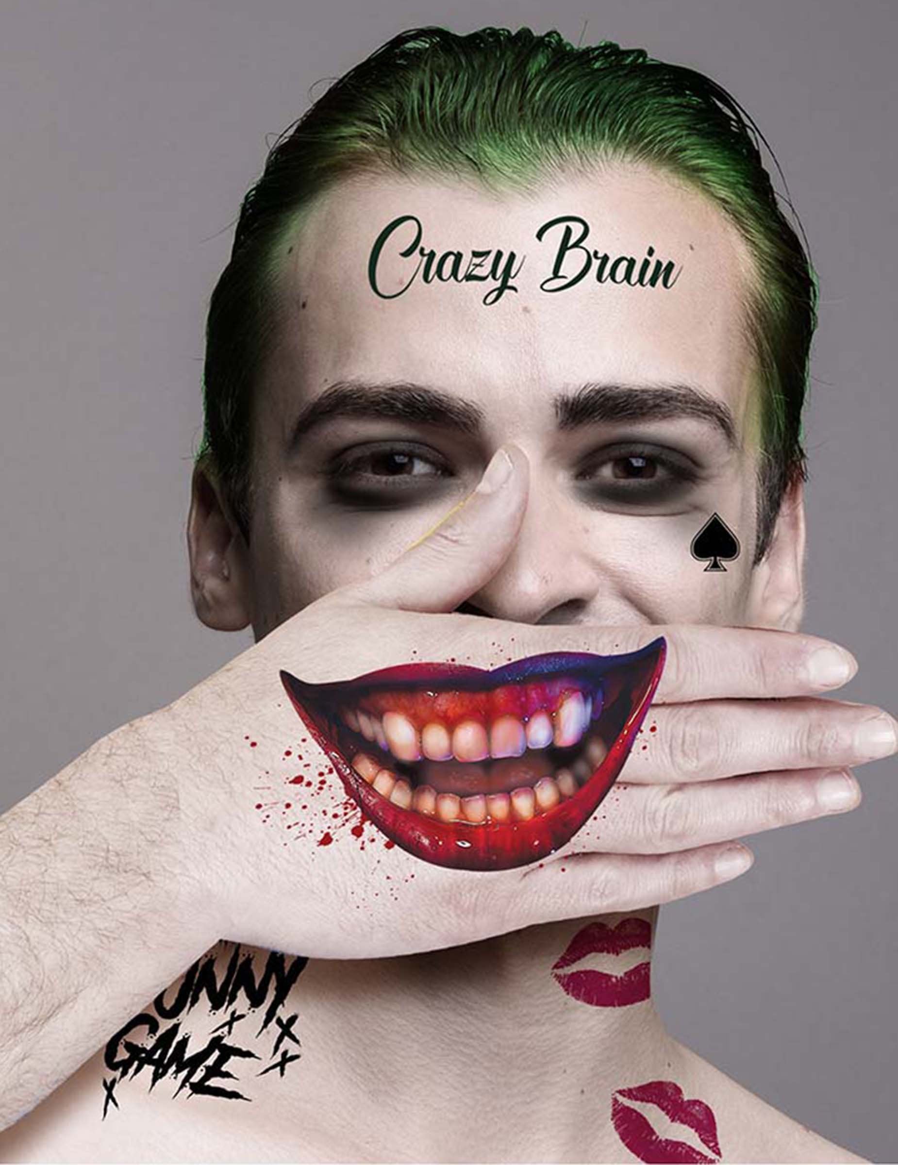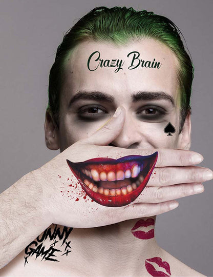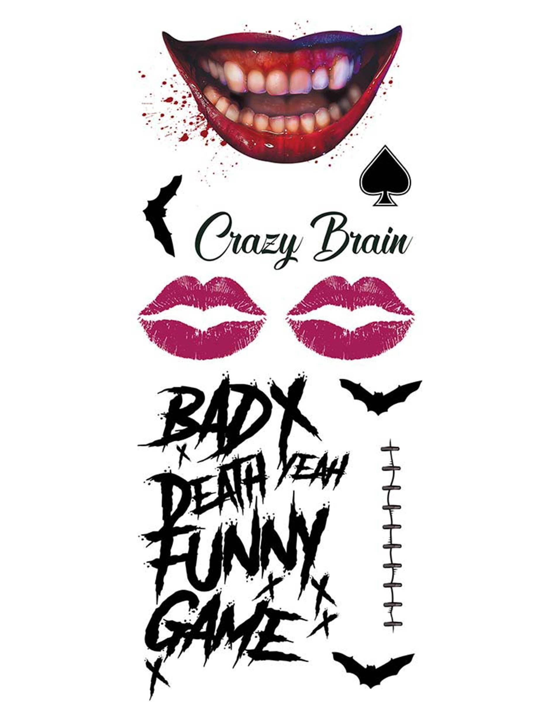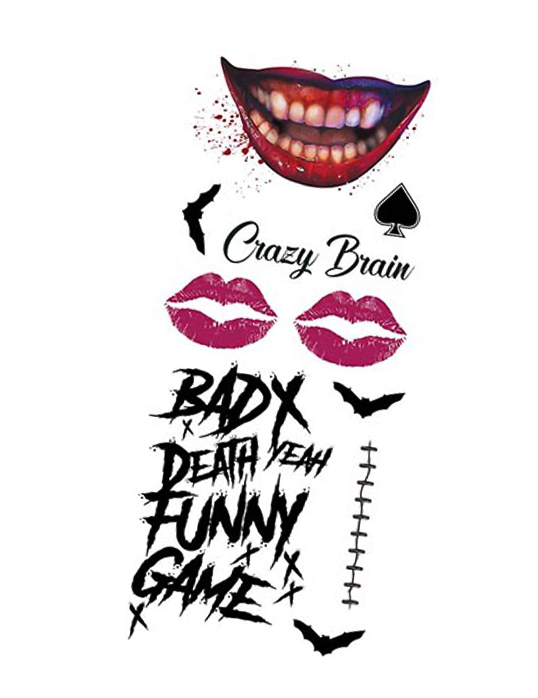 Ez a gonosz Joker tetováló testület körülbelül 30 x 14 cm -t mér. Különböző tetoválásokat tartalmaz, amelyek emlékeztetnek a felejthetetlen jokerre, például a gonosz mosoly, denevérek stb. Ezek az ideiglenes tetoválások tökéletesek lesznek egy gonosz Joker jelmez befejezéséhez egy Halloween este alatt!