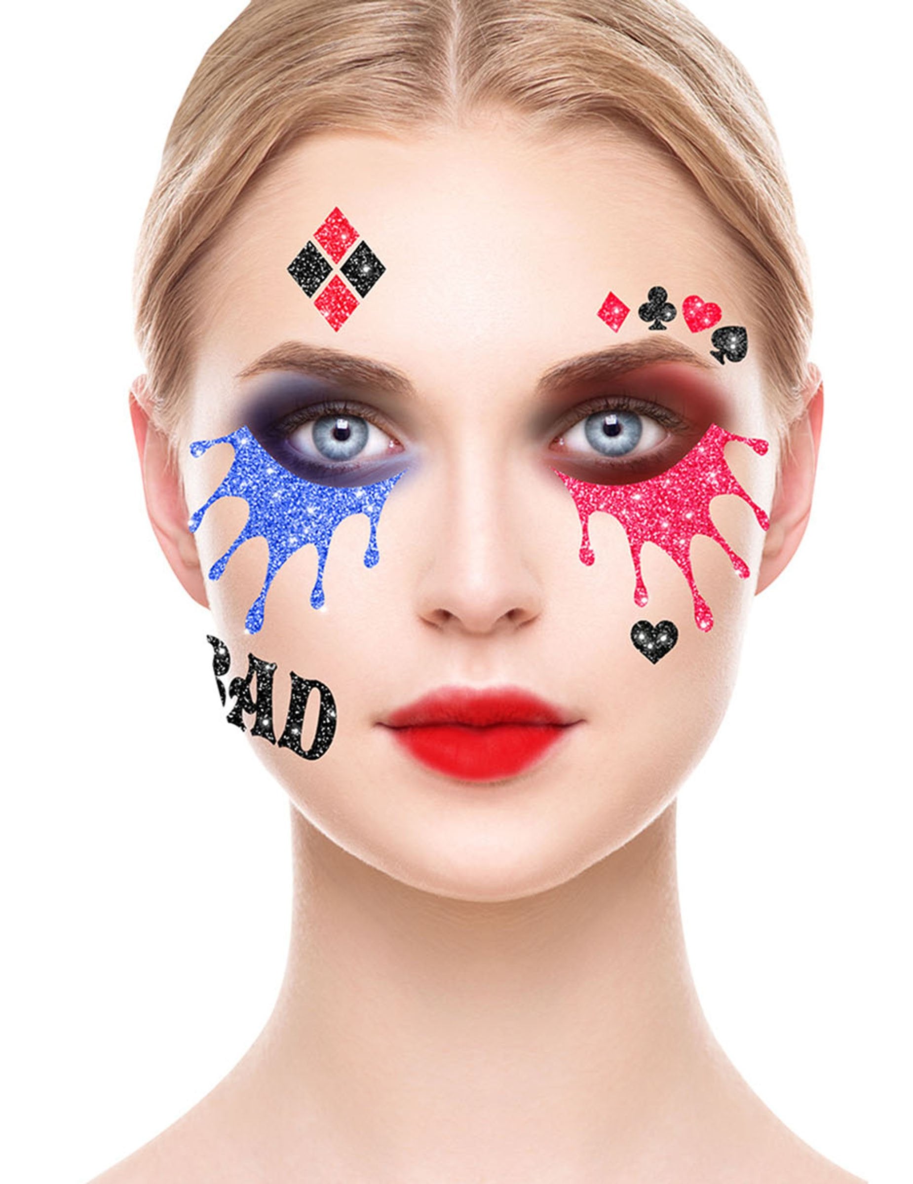 Ez a testület gonosz arlequine tetoválásokat tartalmaz. Ez magában foglalja a különféle csillogó tetoválásokat: kék és rózsaszín könnyeket, egy kis fekete szívet, 2 fekete gyémántot és 2 piros gyémántot, egy gyémántot és egy vörös szívet, fekete ász és a "Bad in Black" szó. Ezek az ideiglenes tetoválások ideálisak a Halloween vagy a következő álruhás estére való gonosz ruhájának kitöltéséhez!