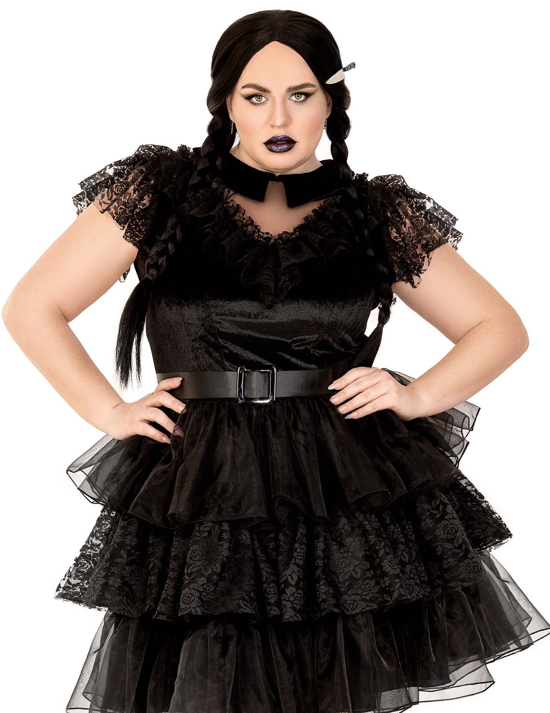 Ez gótikus lázadó jelmez Plus size méreteknek való. Tartalmaz egy ruhát, egy övet és egy hajcsatot.