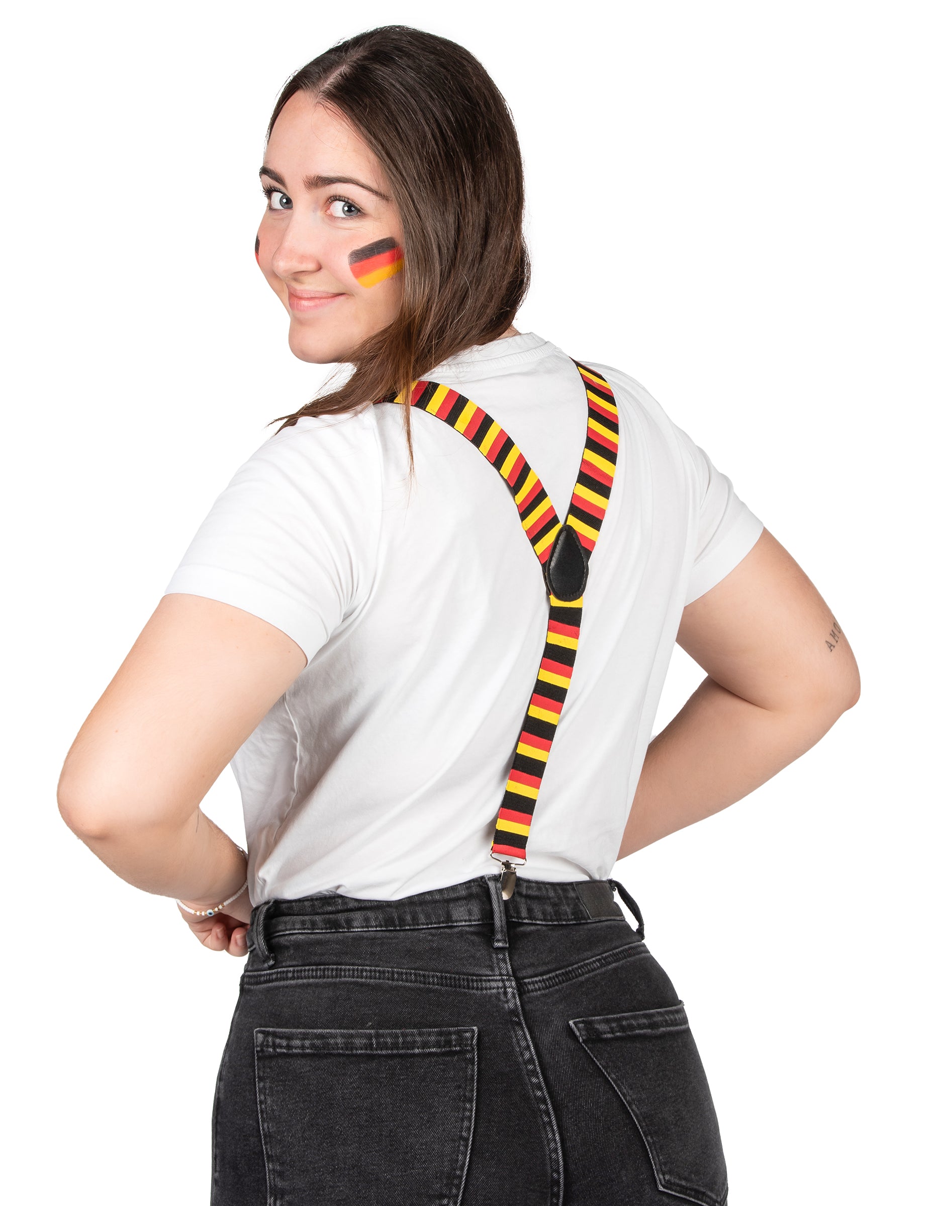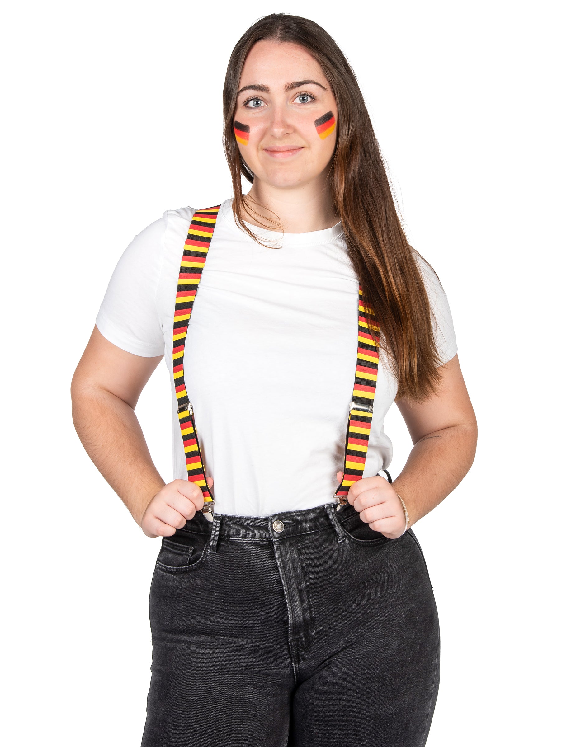 Ezek a német hevederek felnőttek számára készültek. A német zászló képe, fekete, piros és sárga színű. A kapcsolatok lehetővé teszik, hogy könnyen rögzítse őket a nadrágjához. Viselje ezeket a harisnyatartókat a teljes támogató megjelenésért olyan sportversenyek során, mint a labdarúgó -világkupa vagy az olimpiai játékok!