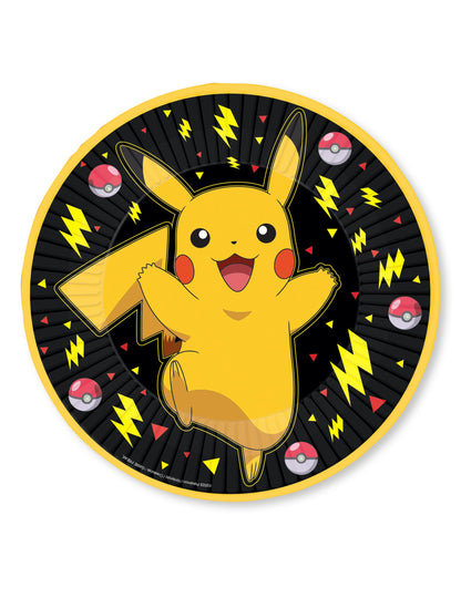 Ezeket a tányérokat a 8 -os 8 -as értékesítik, és hivatalos Pokémon engedély alapján vannak. Kartonból készülnek, és kb. 23 cm átmérőjű. Fekete színű, a középpontban Pikachu és az egész villám, a pokéball, valamint a kis sárga és piros háromszögek képe díszítik. Ezek a lemezek tökéletesek lesznek a Pokémon témájú partira!