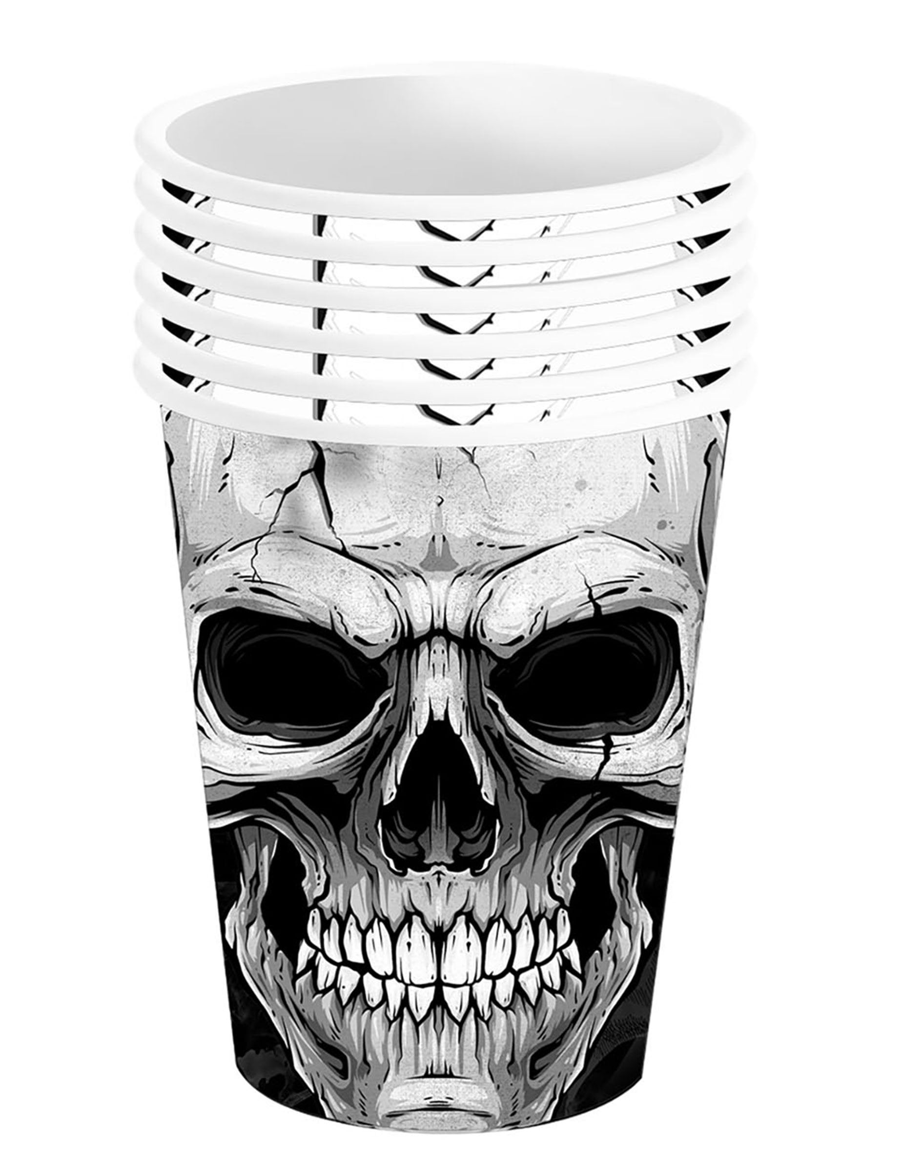 Ez a 6 koponya -csésze tétel kb. 240 ml. A serlegek borzalmas fehér koponyarinta van. Ezek a serlegek tökéletesen elmennek a Halloween asztali dekorációval.