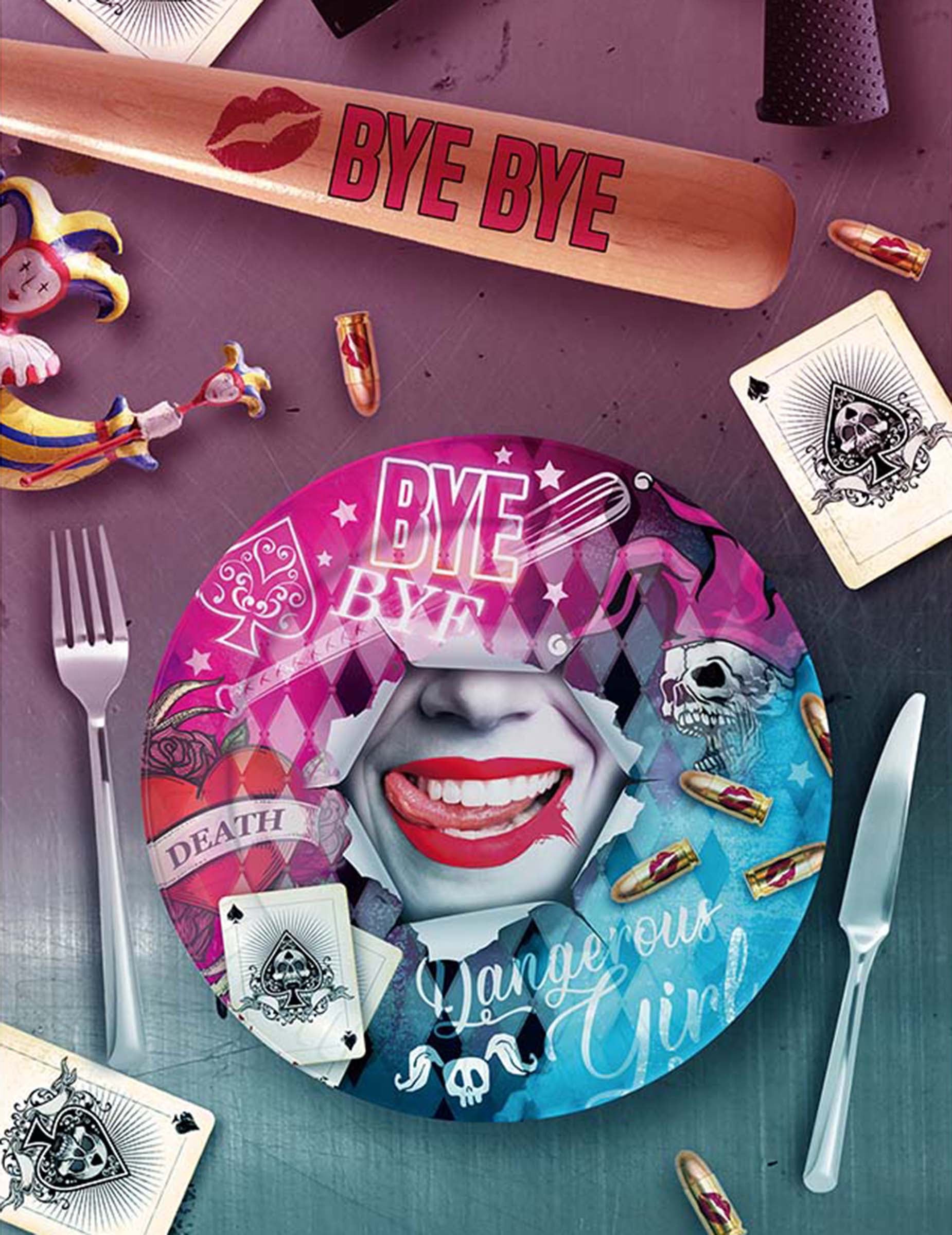 Minden tányér rózsaszín és kék színű, különféle illusztrációkkal, például egy denevérrel, egy koponyával és egy női szájjal, középen piros rúzzsal.