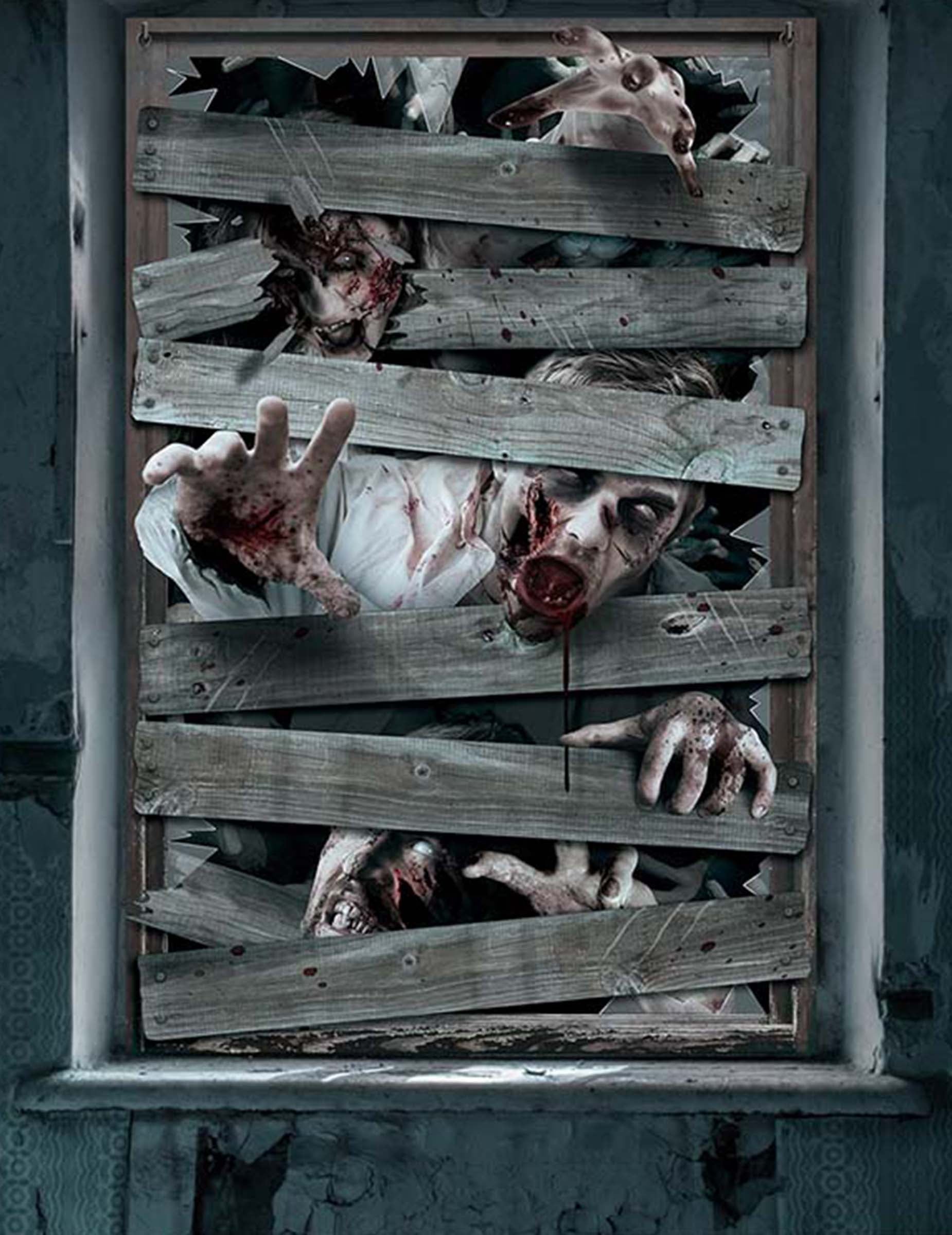 Ez az ablakdekoráció körülbelül 80 x 120 cm -t mér. Az ablakdekoráció a fa deszkák által bebörtönzött zombikat képviseli, amelyek megpróbálnak elmenekülni és megtámadni. Tökéletes lesz a dekoráció befejezéséhez a zombik témájáról a következő Halloween estén!