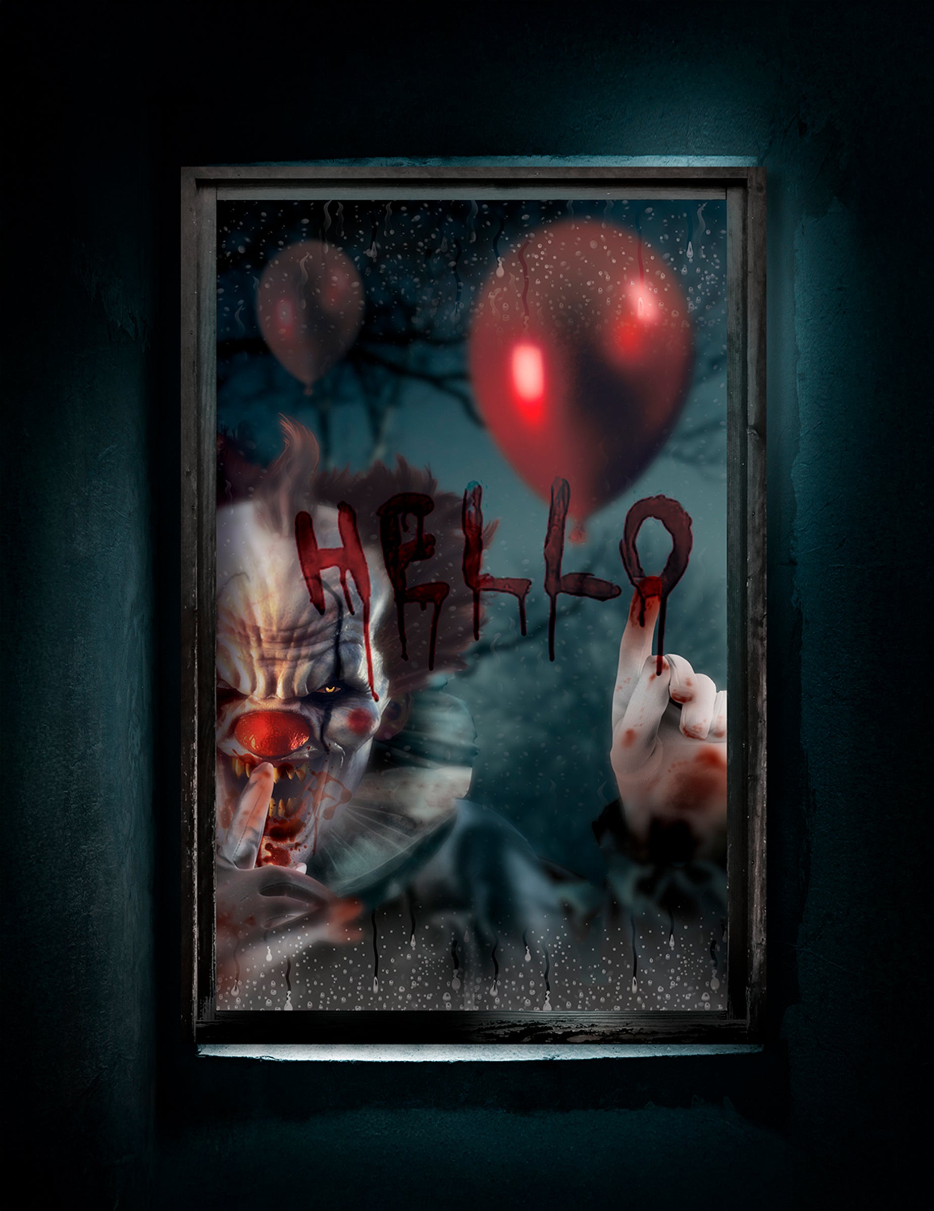 Ez az ablakdekoráció körülbelül 80 x 120 cm -t mér, és egy bérgyilkos bohócot képvisel. Ebben a félelmetes képen egy fenyegető bohóc "hello" vérrel ír az ablak ablakon. Ez egy félelmetes dekoráció lesz, amely tökéletes egy horror témájú partira vagy a Halloweenre!