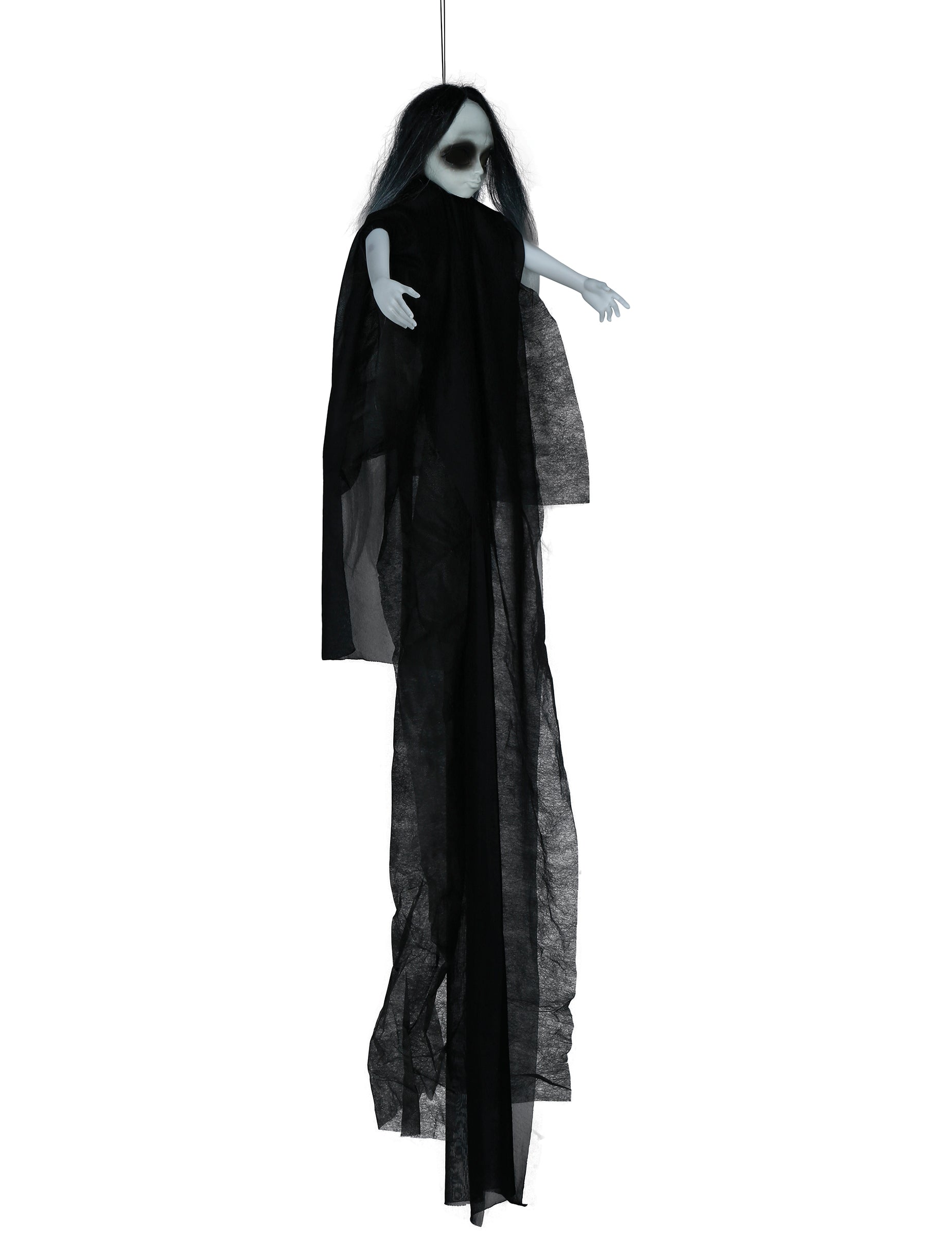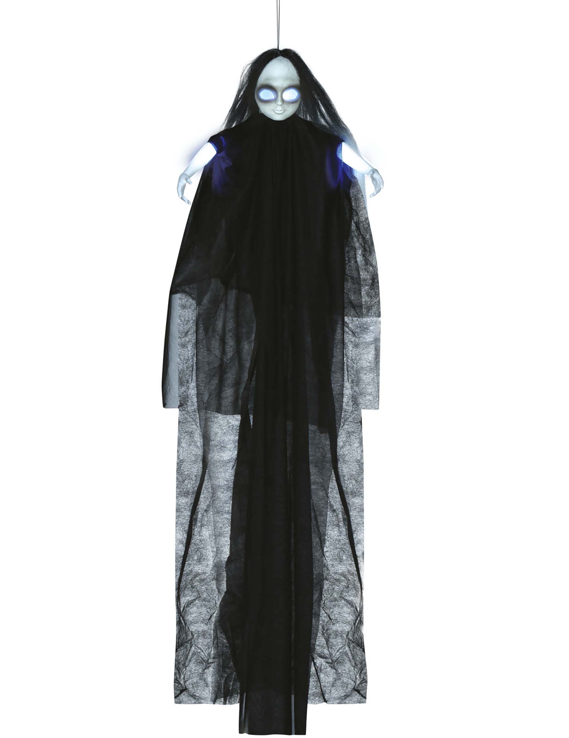 Ez a félelmetes függő baba körülbelül 130 cm -t mér, és könnyű és hangjellemzőkkel van felszerelve, 3 akkumulátorral, azonnali felhasználásra. Reális és baljós részletekkel tervezték, a babának olyan szeme van, amely kék színben ragyog. A hanghatások egy kis további terrorist adnak ehhez a dekorációhoz. Tökéletes a Halloween -ünnepségekhez, a horror témájú estékhez vagy a kísértetjárta ház látnivalókhoz, ez a félelmetes baba ideális zavaró légkör kialakításához. Tegye le egy bejáratba, egy teraszon vagy egy sötét szobában, hogy meglepje és megijesztse a vendégeket.