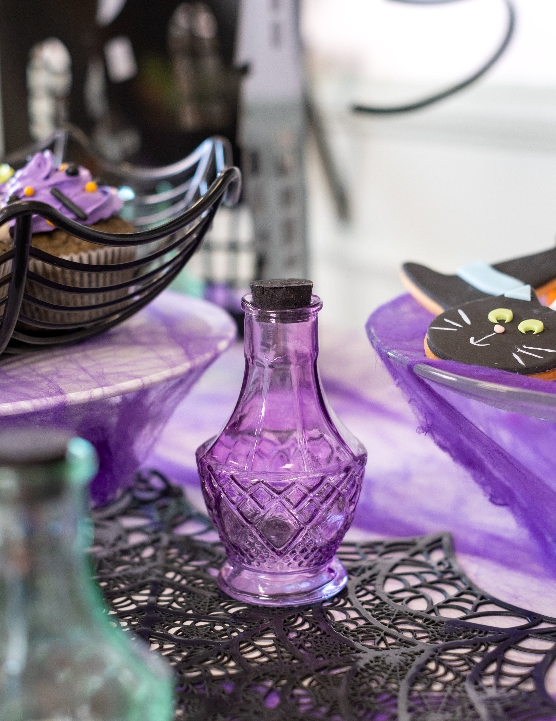 Ez az üvegfiola 6,5 hüvelykes. cm átmérőjű és 11,5 cm Magas és lila árnyalatú. Egy kicsi, rusztikus megjelenésű fekete parafa dugó szorosan lezárja az üveget, így ideális misztikus főzetek tárolására. Ez a lila üvegpalack tökéletes asztaldíszként vagy kiegészítőként egy varázsló laboratóriumában. Vigyél egy csipetnyi varázslatot a halloweeni bulidba ezzel a kis üveggel. Tökéletesen alkalmas arra, hogy elbűvölő hangulatot teremts az ünnepi vagy halloweeni összejöveteleiden.