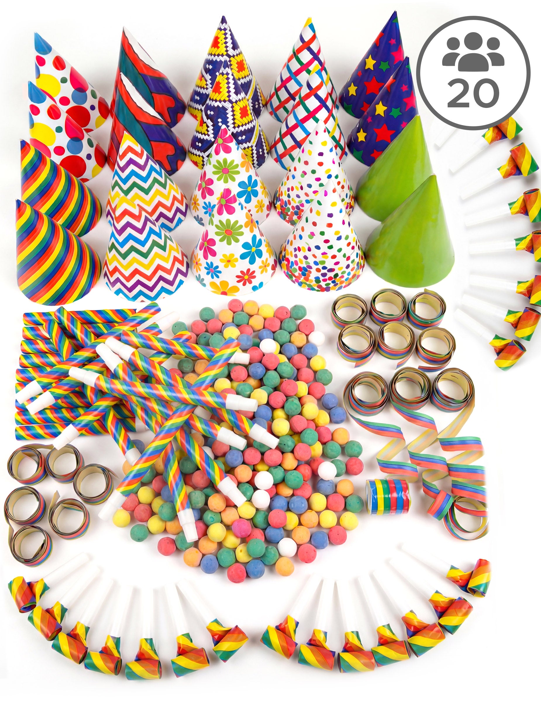 Ez többszínű parti ajándékkészlet 20 fő befogadására alkalmas, és a következőket tartalmazza: