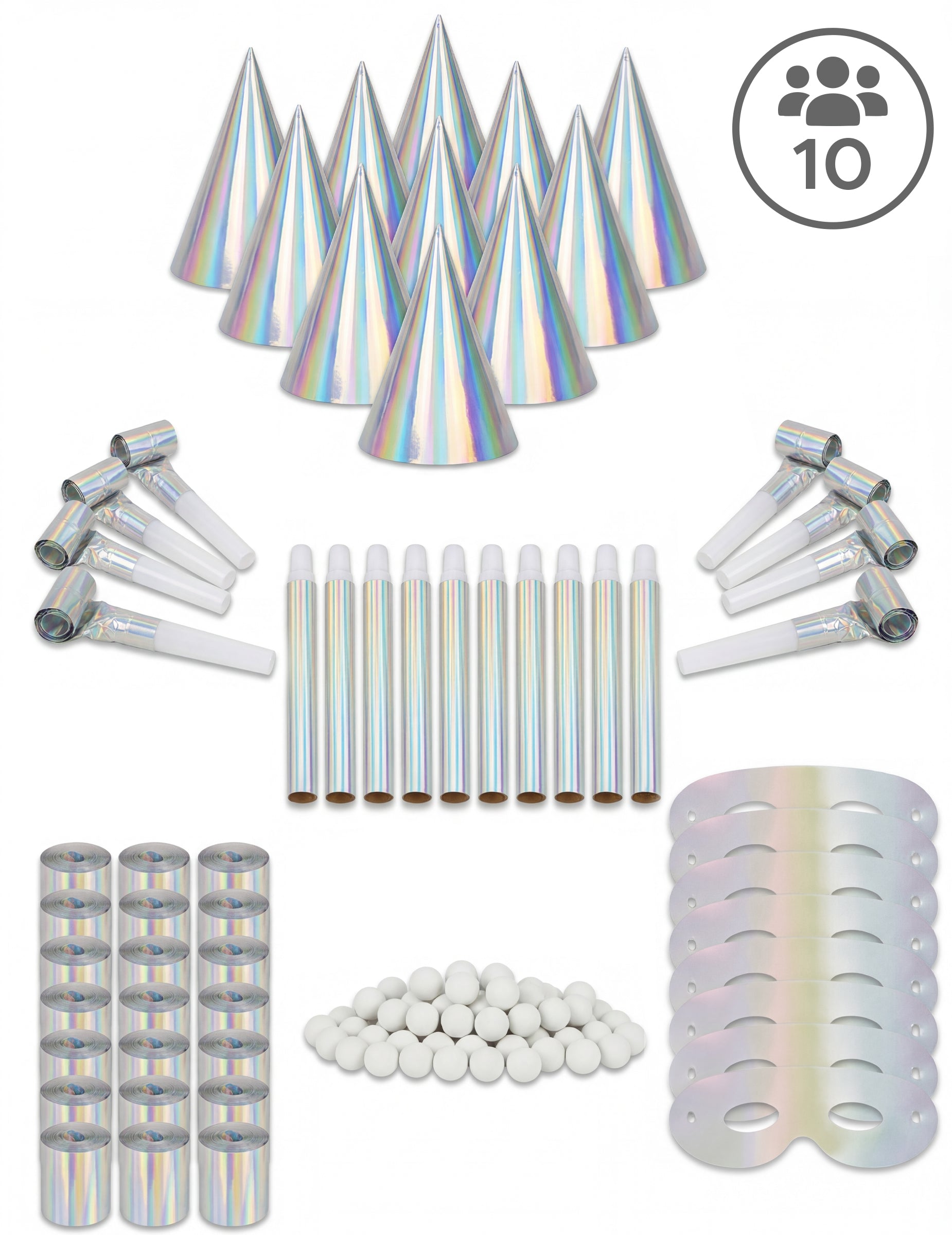 A 10 darab irizáló tükröződésű papírkalap holografikus felülettel rendelkezik, amely minden szögből csillog és visszaverődik a fényből.
