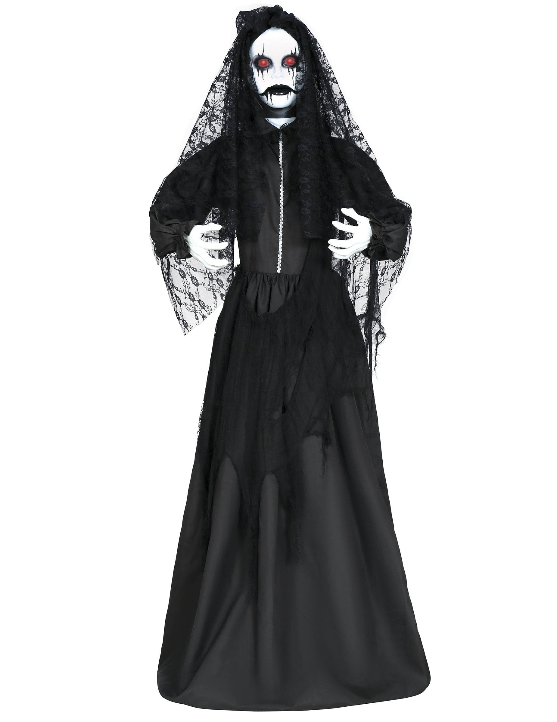 Hosszú, fekete ruhát visel, fekete csipkefátyollal, és a következőket viseli:világítási effektek Vörös szemeivel és a hátborzongató hangulatot felerősítő hangfunkciójával, automatikus mozgásainak köszönhetően pedig szinte életre kel, még lenyűgözőbb élményt nyújtva.