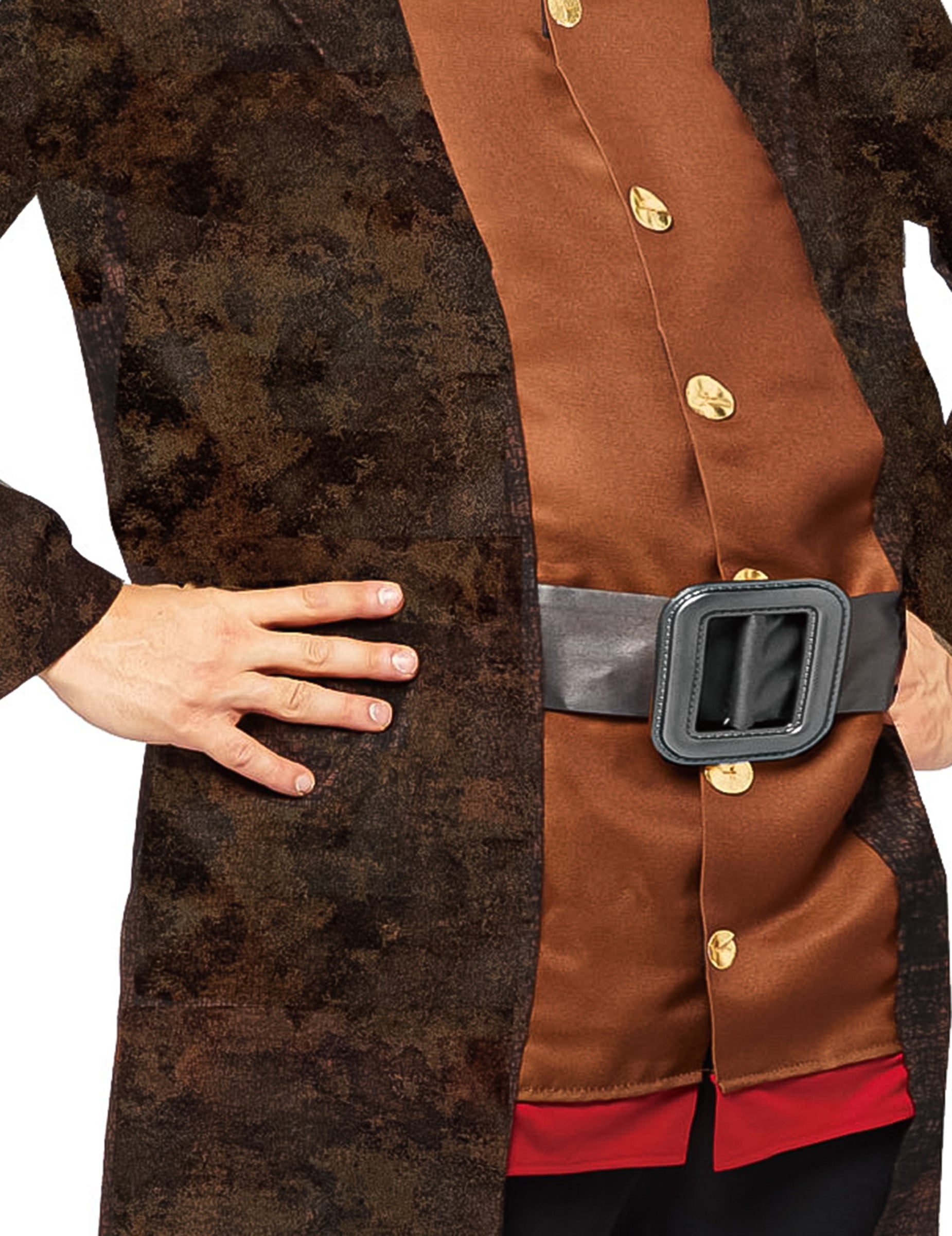 A széles öv, amely egy nagy, négyzet alakú ezüst csattal van felszerelve, a derekánál összehúzza a ruhát, realisztikus és feltűnő részletet adva a jelmeznek.