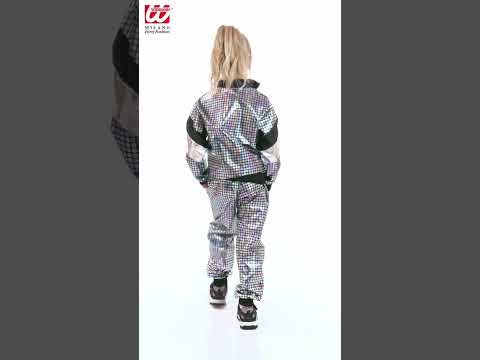 A szett egy ragyogó, holografikus, sokszínű fényvisszaverő kabátból áll, amelyet úgy terveztek, hogy a fények alatt tündököljön és minden tekintetet magára vonzzon. Cipzárral és kontrasztos fekete gallérral rendelkezik, így ötvözi a retro stílust a praktikus kényelemmel.