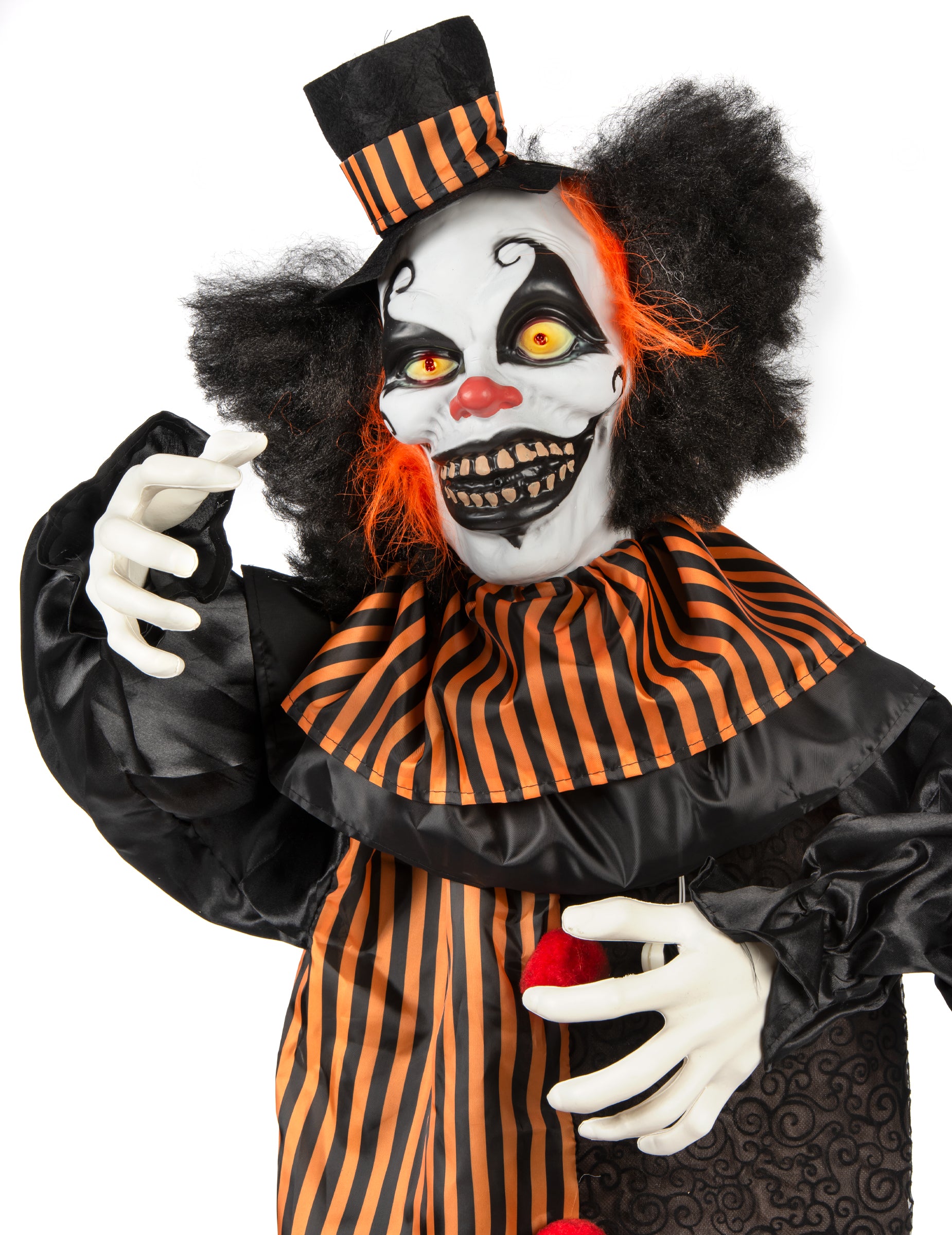 170-esével cm Nyugtalanító megjelenésével ez az animált bohóc magára vonja a figyelmet. Baljóslatú sminkje, éles fogai és sötét csíkos ruhája félelmetes teremtménnyé teszi. Hanggal aktiválódik: karjai mozognak, feje forog, vörös szemei felvillannak, és egy átható sikoly visszhangzik a szobában. 3 db AA elem szükséges hozzá (tartozék). Tökéletes kísérteties hangulat megteremtéséhez a halloweeni dekorációkban.