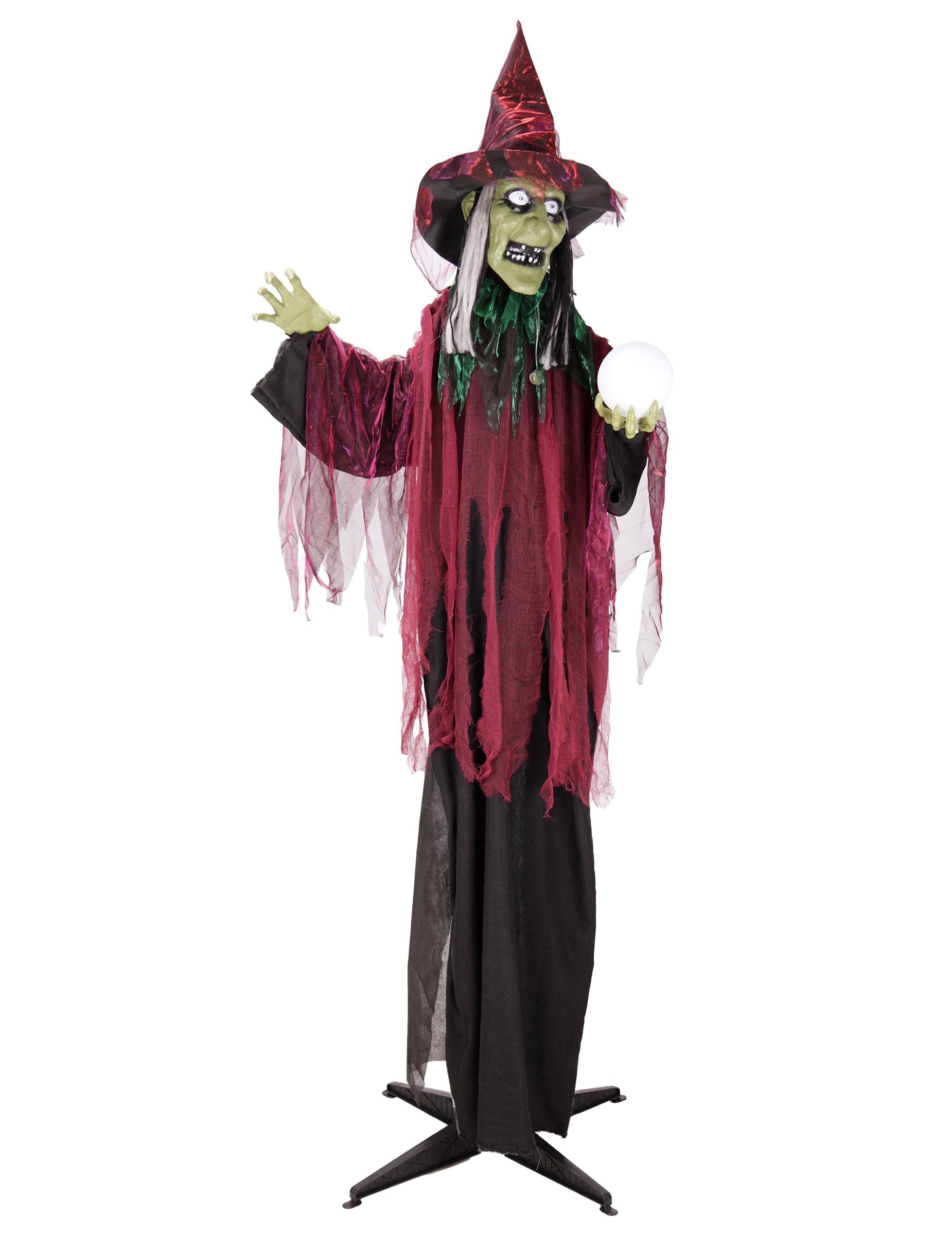 Haute de 168 cm, cette sorcière animée s’impose par sa présence inquiétante. Son visage grimaçant, ses cheveux sombres, et sa tenue déchirée violette et noire renforcent son allure de prêtresse noire. Elle s’éveille au son ambiant : sa tête se met à tourner, ses bras bougent autour de sa sphère lumineuse, et un hurlement maléfique résonne aussitôt. Fonctionne avec 3 piles AA (non incluses). Un décor vivant pour une soirée d’Halloween mémorable et terrifiante.