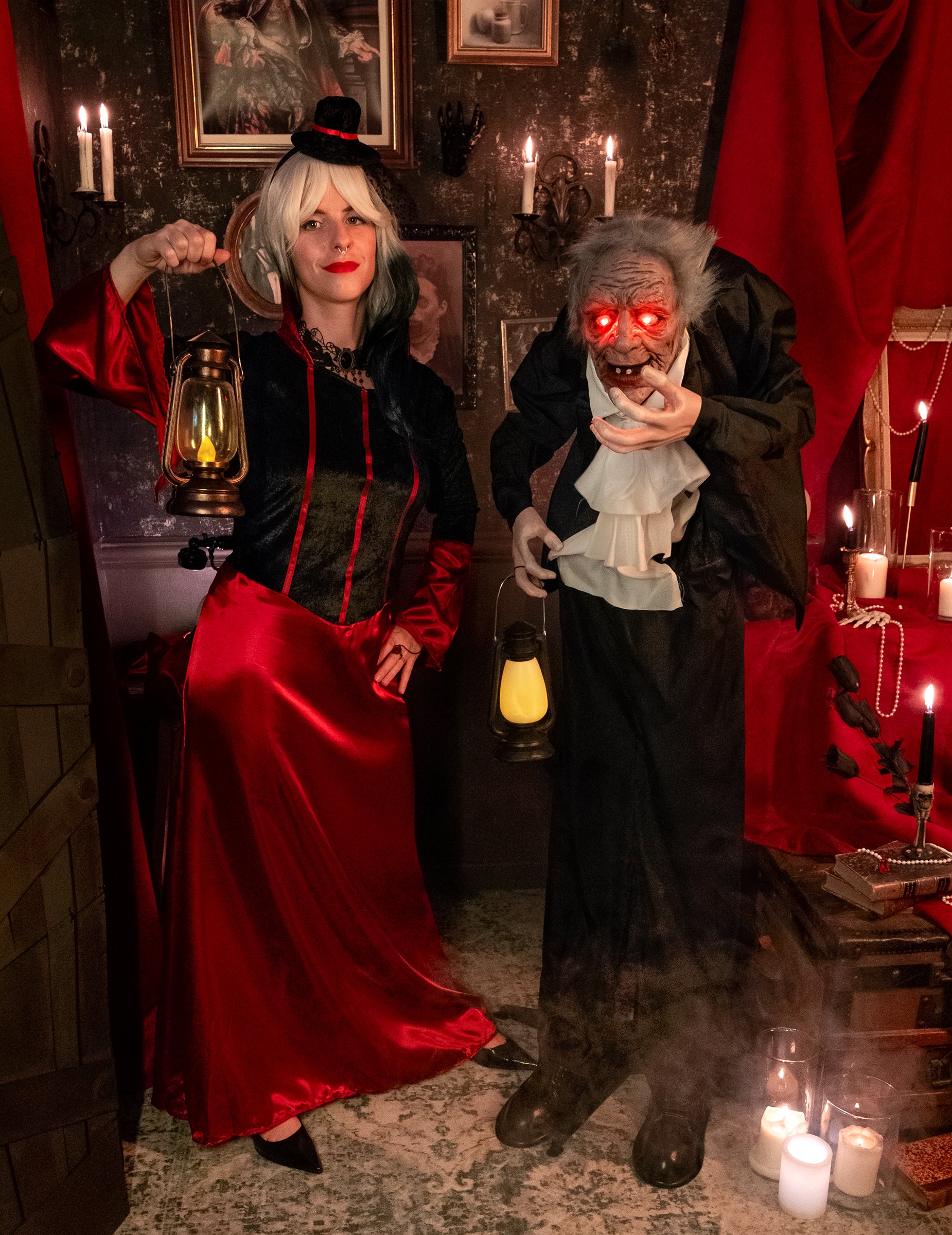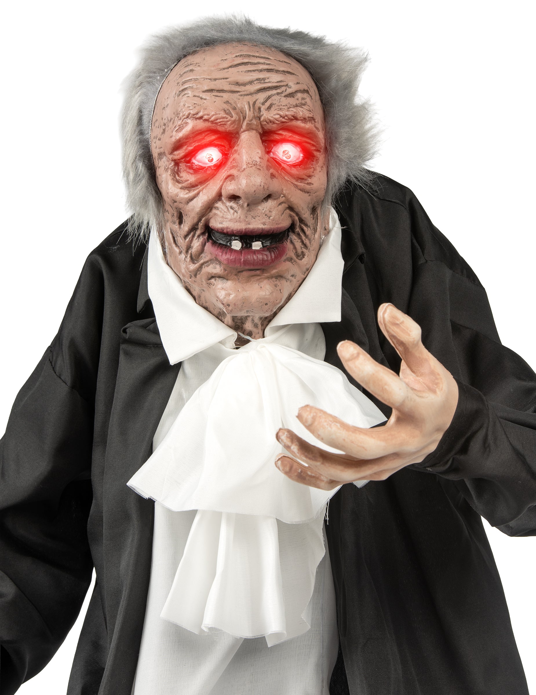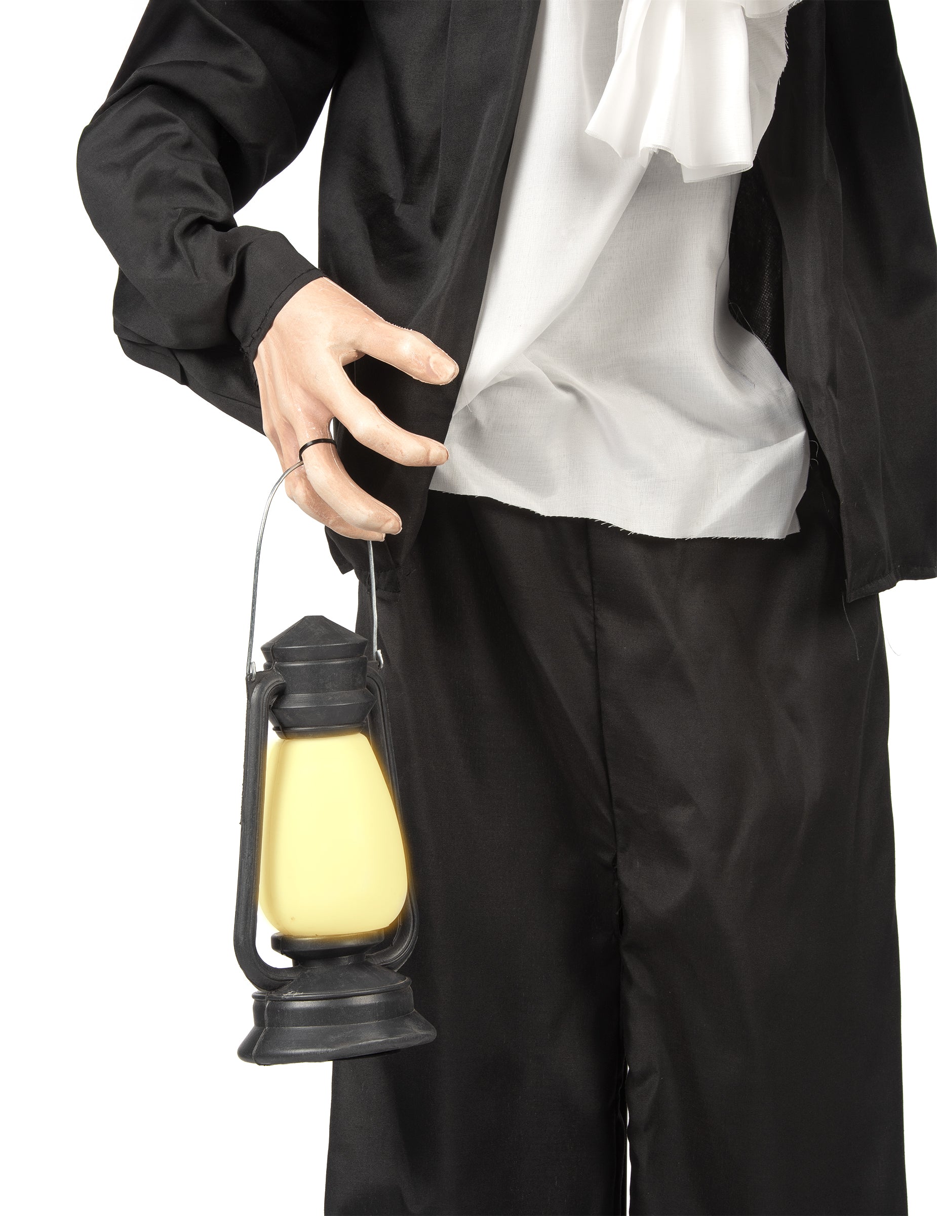 Ez az elátkozott őrző lámpással, 158 x 120 cm, Azt a nyugtalanító érzést kelti, mintha egy elhagyatott helyet őrizne. Nyugtalanító arca, fáradt vonásai és görnyedt testtartása azonnal bizalmatlanságot kelt. Sötét ruhát visel, amelyet fodros ing kontrasztja, és egy komor, felgyújtásra kész lámpást lóbál. Amikor zaj hallatszik, baljós kiáltás tör ki, mintha átok ébredt volna fel. A figurában és a lámpájában található elemek ideálisak ennek a hátborzongató jelenetnek az aktiválásához, tökéletesek egy magával ragadó és félelmetes látványhoz.