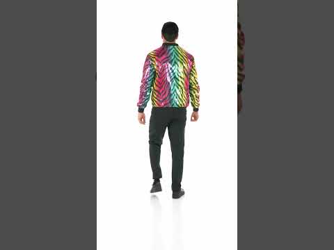 Egyedi dizájnja csillogó flitterekkel ragyog. szivárványFeltűnő vizuális hatást kelt. A gallér, a mandzsetták és a derék fekete bordázott szegélyei kontrasztos megjelenést és tökéletes illeszkedést biztosítanak, míg az elülső cipzár praktikus és modern dimenziót kölcsönöz.
