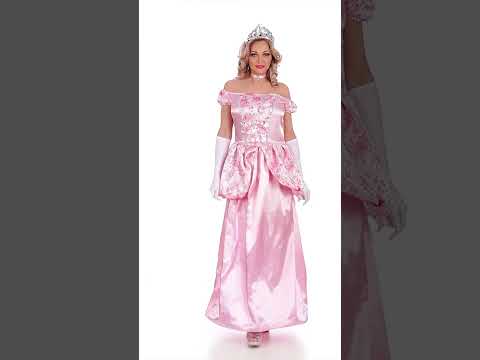 Ez a halványrózsaszín hercegnő jelmez nőknek egy hosszú ruhából, egy pár kesztyűből, egy nyakláncból és egy tiarából áll.