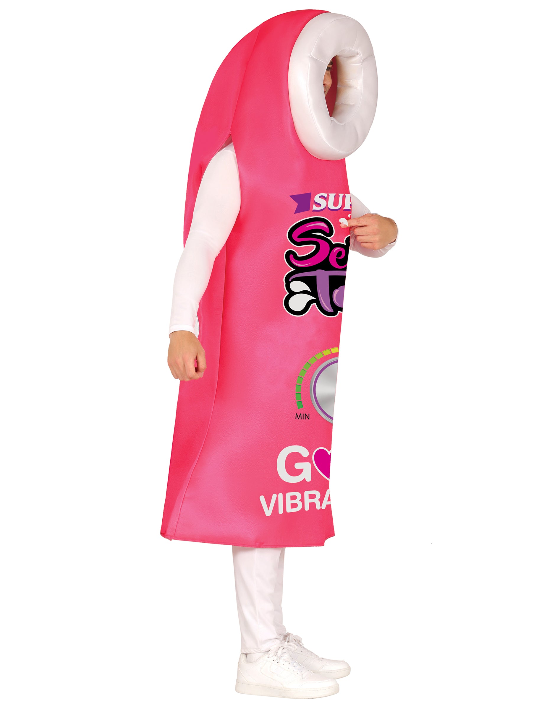Ez a humoros felnőtt vibrátor jelmez egy rózsaszín tunikából áll. A nagy, nyomtatott számlappal és a vidám "Good Vibrations" felirattal garantáltan humoros és merész megjelenést kölcsönöz.