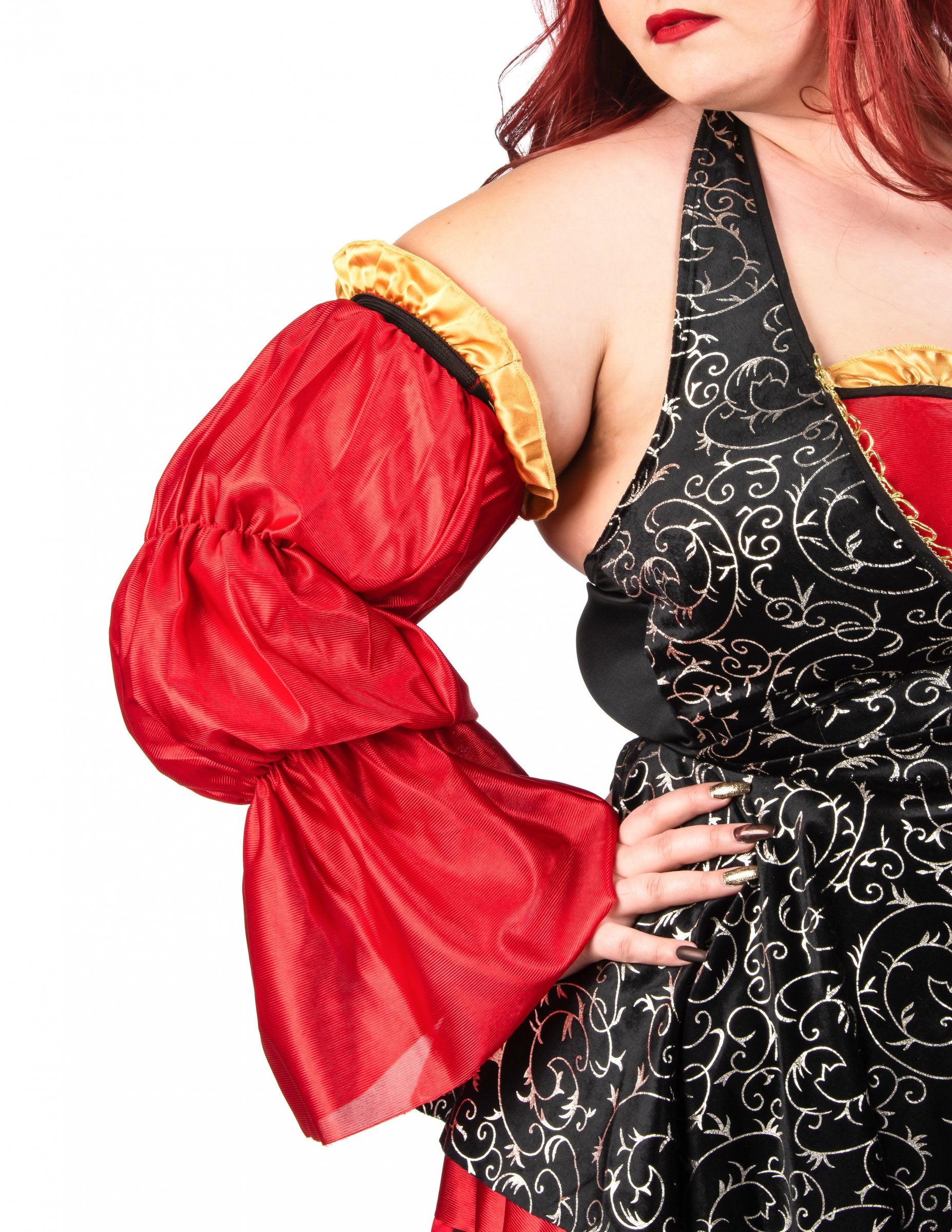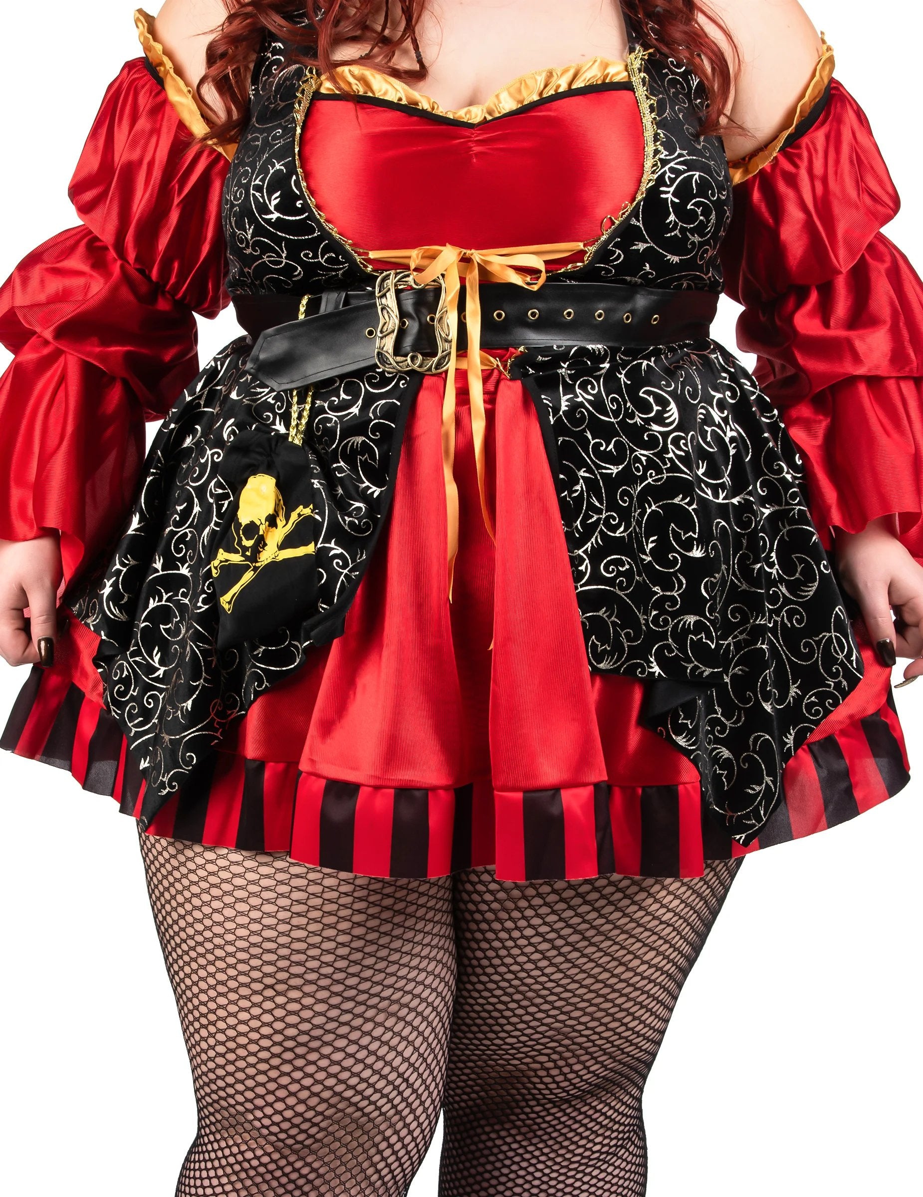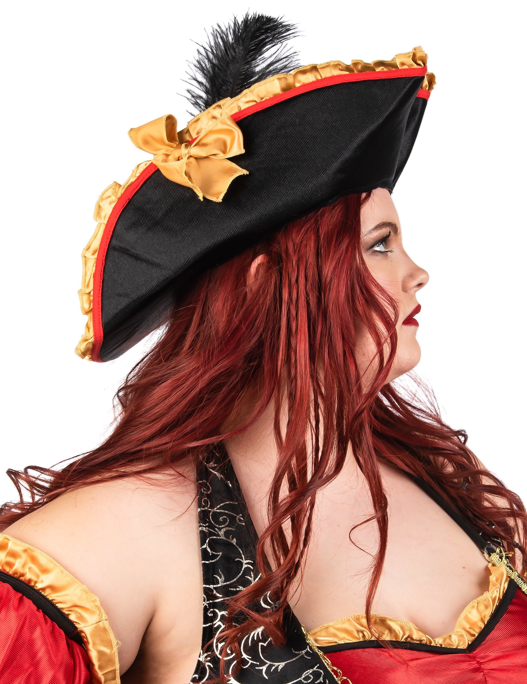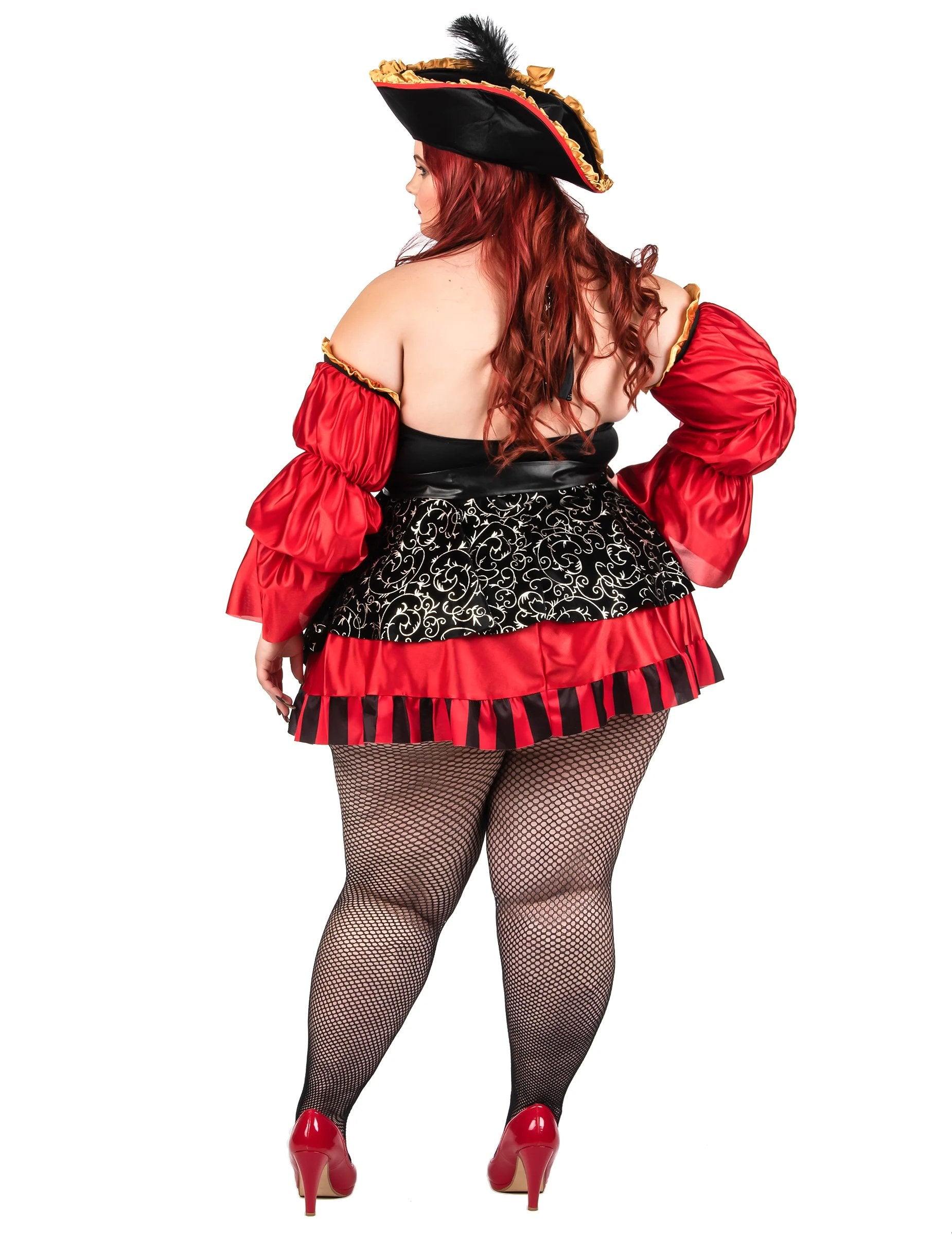 Ez a nagy, nagy luxus vörös kalóz jelmez a nők számára egy ruhából, egy tricorne -ból, két ujból, övből és ösztöndíjból áll. A ruha elegánsan keveri össze az intenzív vörös és arany barokk mintákat fekete háttérrel, kiemelve a merész és kifinomult stílust. A puffadt hüvelyek és a csíkos szoknya hangerőt és karaktert hoznak ehhez a ruházathoz, amelyet a kalózkodás ihlette. A Tricorne egy arany szélén, a fűző effektuson és a kis megfelelő támogatás kiegészíti ezt a lángoló kapitány megjelenését. Ideális jelmez a legendás kalóz megtestesítéséhez egy karnevál, jelmezes este vagy egy tengeri témával rendelkező fesztiválon.