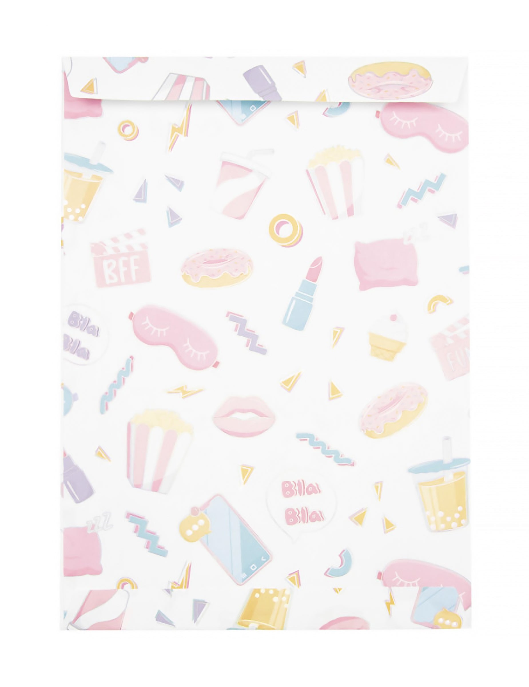 Fokozza a születésnapok és a tiéd tematikus bulik barátok között ennek a készletnek köszönhetően 8 ajándéktasak 15 x 21 formátum cm, kifejezetten a következőhöz tervezve: pizsamaparti Sikerült! Ezek a papírzacskók imádnivaló pasztell illusztrációkkal, például fánkokkal, pattogatott kukoricával és szépségápolási kiegészítőkkel díszítettek, meleg és hívogató hangulatot teremtve. Tökéletesek arra, hogy finomságokat vagy apró ajándékokat kínáljunk a vendégeknek, miközben egy csipetnyi édességet visznek az asztalra.