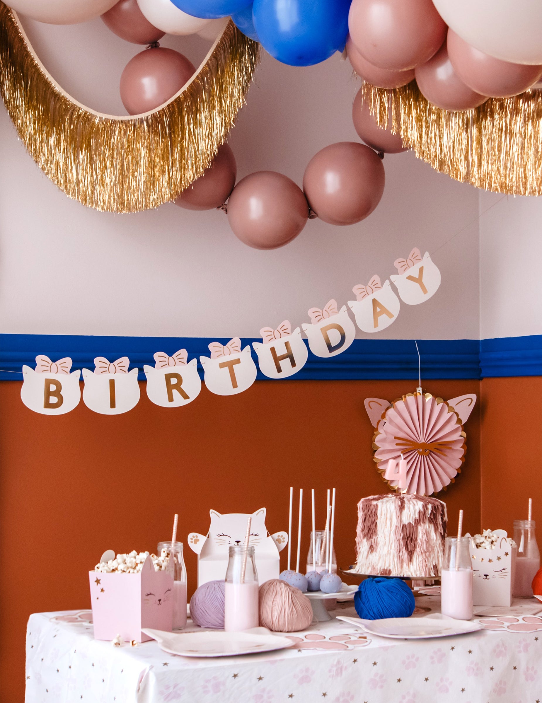 Ünnepelj egy születésnap mindezt gyengéden „Boldog születésnapot” girland Ez a 2,8 méteres banner, finom rózsaszín masnikkal díszítve, világos alapon arany betűkkel, elegáns és kifinomult hangulatot kölcsönözve macskás témájú dekorációidnak. Arany szalagjával könnyen felakasztható, gyönyörűen díszíti majd a falakat vagy a büféasztalt, felejthetetlen emlékeket teremtve. Ideális kiegészítő egy bájos és szívmelengető ünnepléshez.