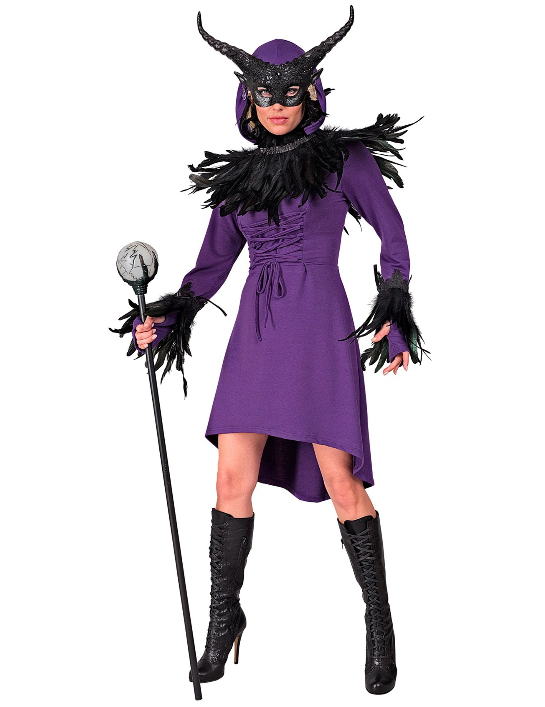 Ezt a lila középkori gótikus ruhát a nők számára egy áramló szövetben tervezték, elegáns, kissé fellendült vágással. Egy integrált motorháztetővel rendelkező ruhából áll, elülső nyakkendővel, amely kiemeli a derékot. A hosszú hüvelyek és a hátulsó aszimmetrikus vágás drámai érintést ad az együttesnek. Ideális boszorkány, középkori nemes vagy misztikus lény jelmezhez, ez a ruha tökéletes lesz Halloween, gótikus estére vagy középkori rendezvényre.