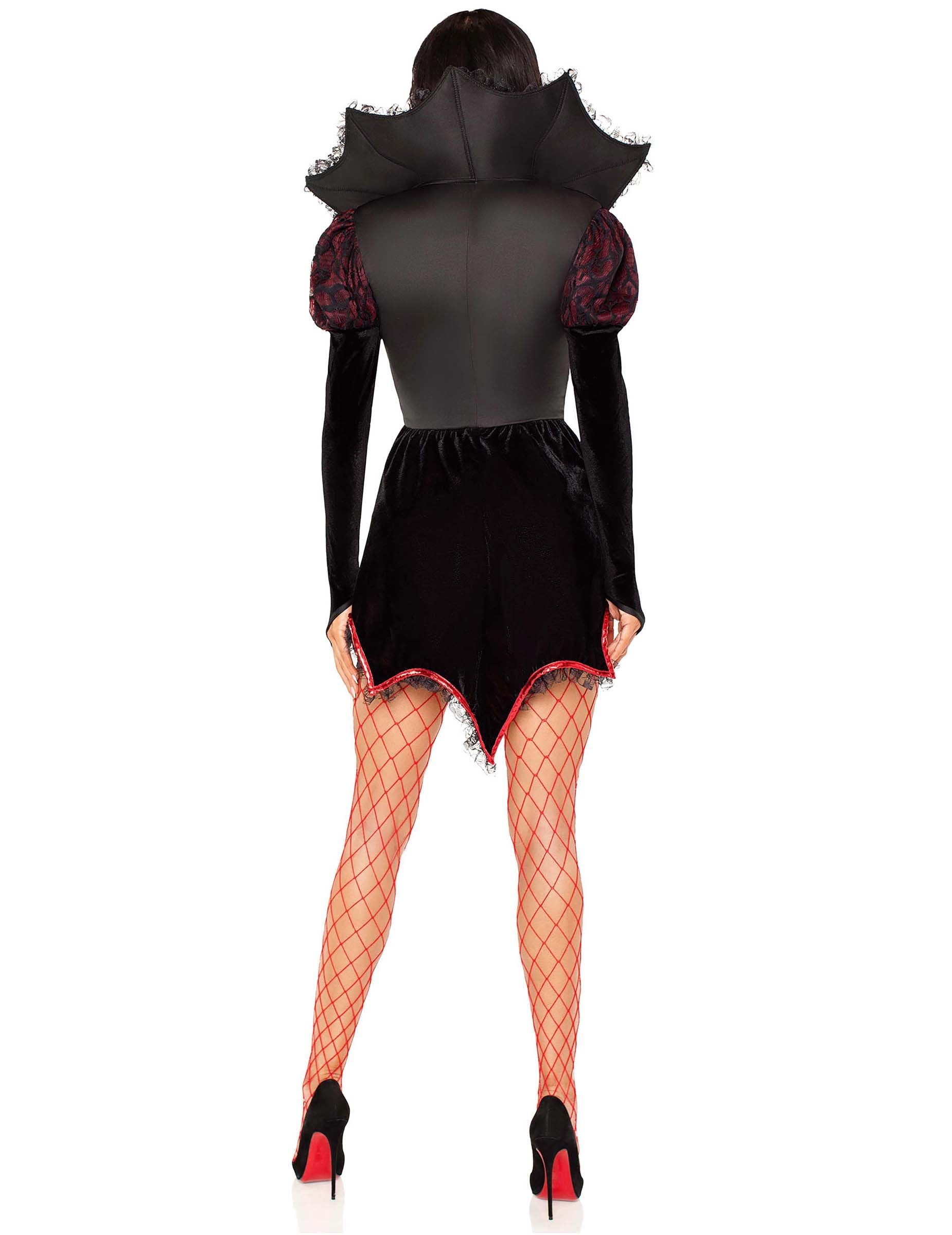 Ez szexi piros-fekete vámpír jelmez Ez a női ruha egy rövid fekete ruhából áll, melynek mellkasán fekete csipke díszíti a piros panelt, és vékony pántok biztosítják a finom tartást. A felsőrész csábító kontraszttal emeli ki a nyakkivágást.
