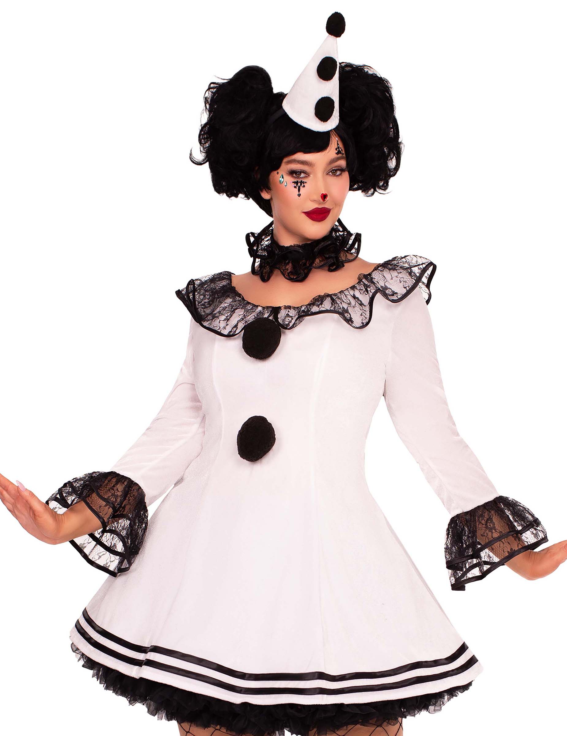Ce déguisement de Pierrot blanc pour femme grande taille se compose d’une robe courte ornée de pompons noirs, d’un col claudine à volants et d’un chapeau assorti. Avec sa coupe évasée et sa base volantée, la robe évoque l’univers du cirque ancien tout en mettant en valeur la silhouette avec élégance. Les pompons contrastants sur le devant apportent une touche classique, tandis que les détails en dentelle noire sur les manches et l’encolure ajoutent un charme mystérieux. Le col plissé et le mini chapeau pointu viennent compléter ce look unique, parfait pour incarner un personnage à la fois troublant et fascinant, entre rêve et frissons. Une tenue idéale pour une soirée costumée ou pour votre prochain Halloween !