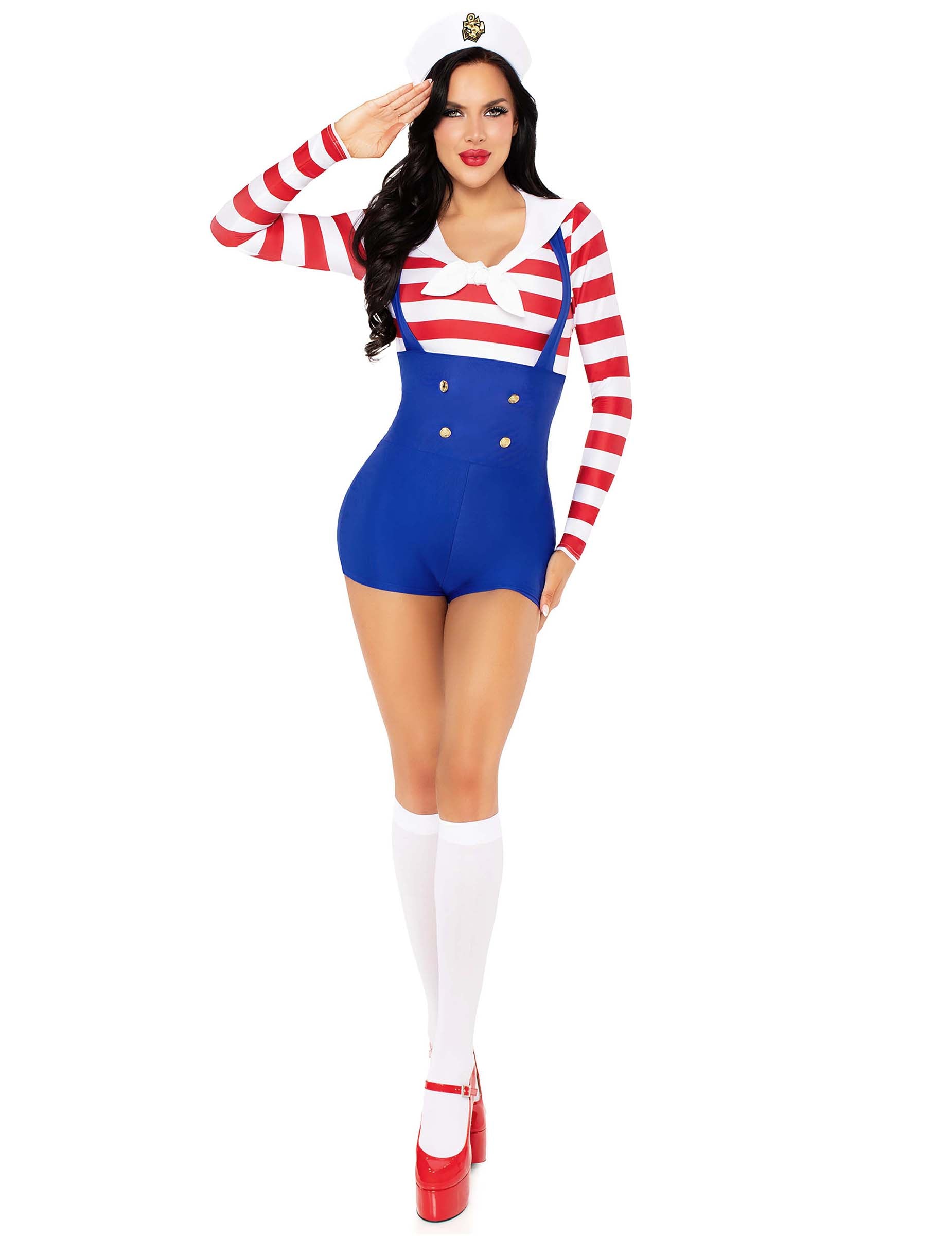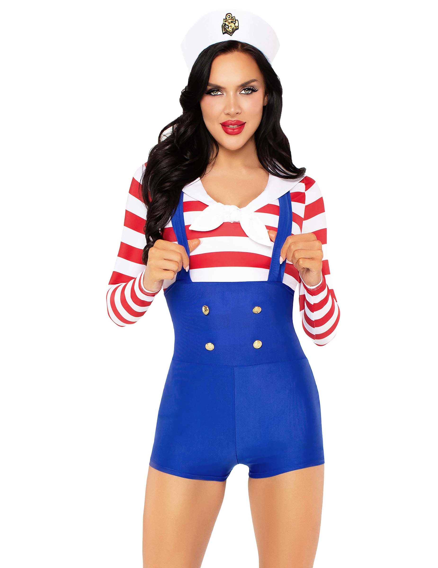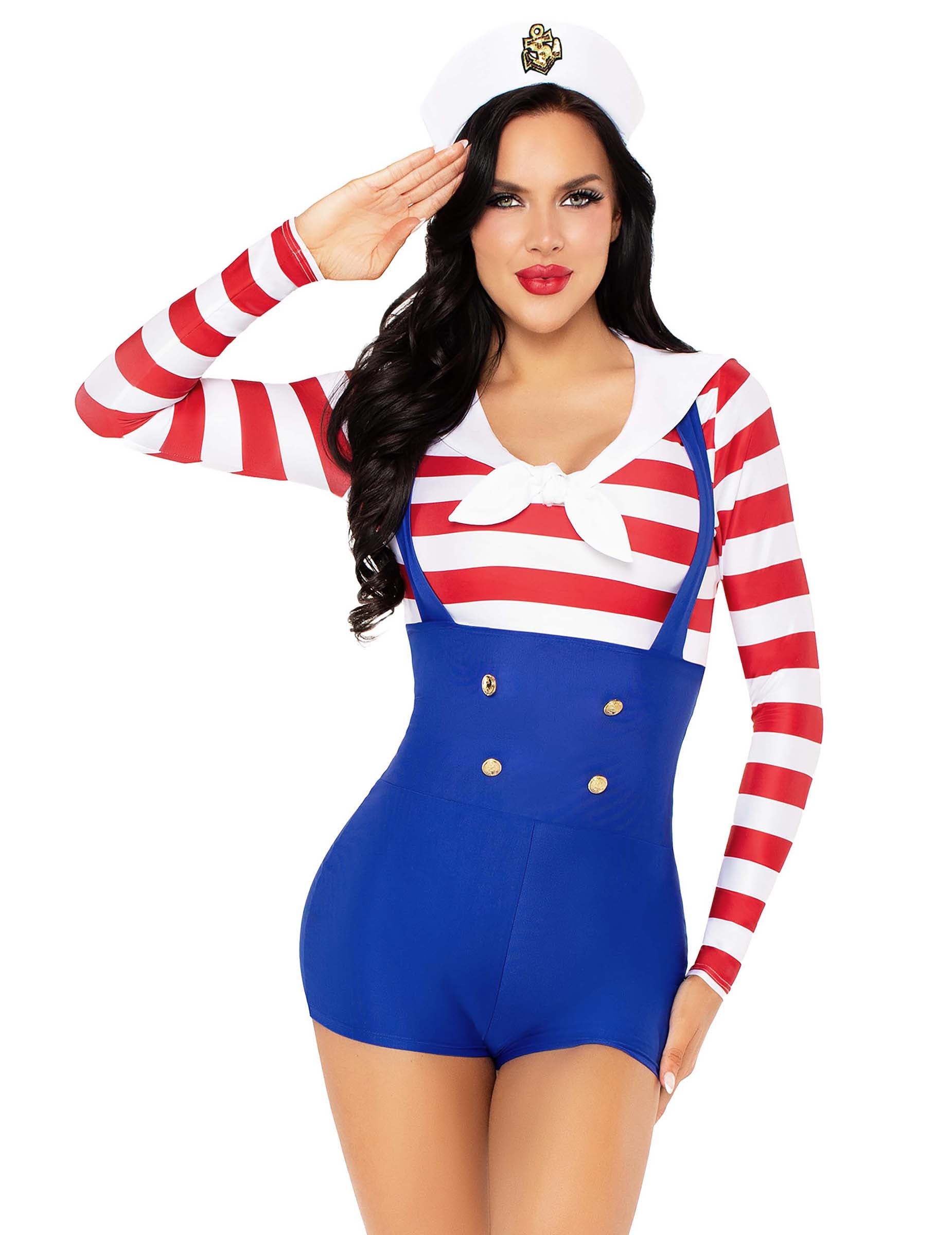 Ce déguisement marin rétro sexy pour femme se compose d’un combishort effet salopette bleue et d’un haut à rayures rouges et blanches cousu à l’ensemble. Le col blanc à l'encolure accentue le style vintage de cette tenue. Des boutons dorés décoratifs viennent structurer la partie salopette avec élégance. La tenue est complétée par une coiffe blanche ornée d’un emblème doré, idéale pour rappeler les tenues de commandement. Ce costume est parfait pour faire sensation lors de vos soirées à thème marin ou pour fêter Carnaval avec une touche rétro assumée.