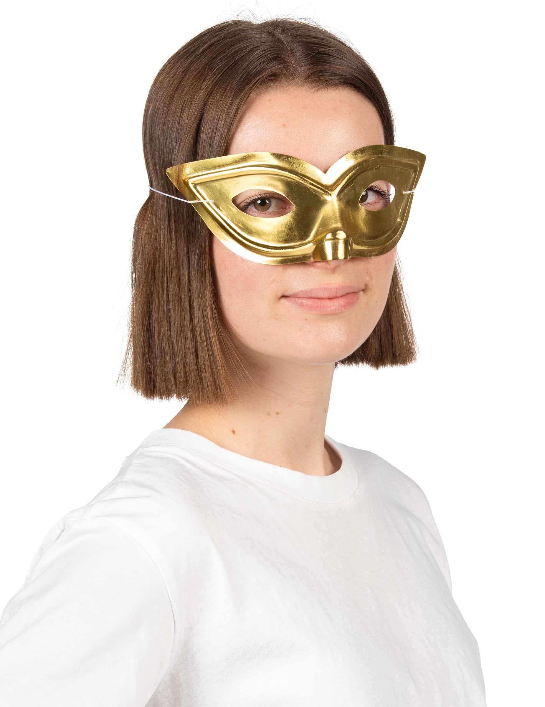Ez a csillogó arany maszk felnőtteknek vékony műanyagból készült, fémes bevonattal, ragyogó és elegáns hatást keltve. Karcsú formája követi az arc körvonalait, és diszkrét gumiszalaggal könnyen rögzíthető, így kényelmes viseletet biztosít egész este. Tökéletes kiegészítője lehet egy álarcosbálnak, karneválnak vagy jelmezbálnak, miközben káprázatos arany árnyalatot ad a megjelenésednek.