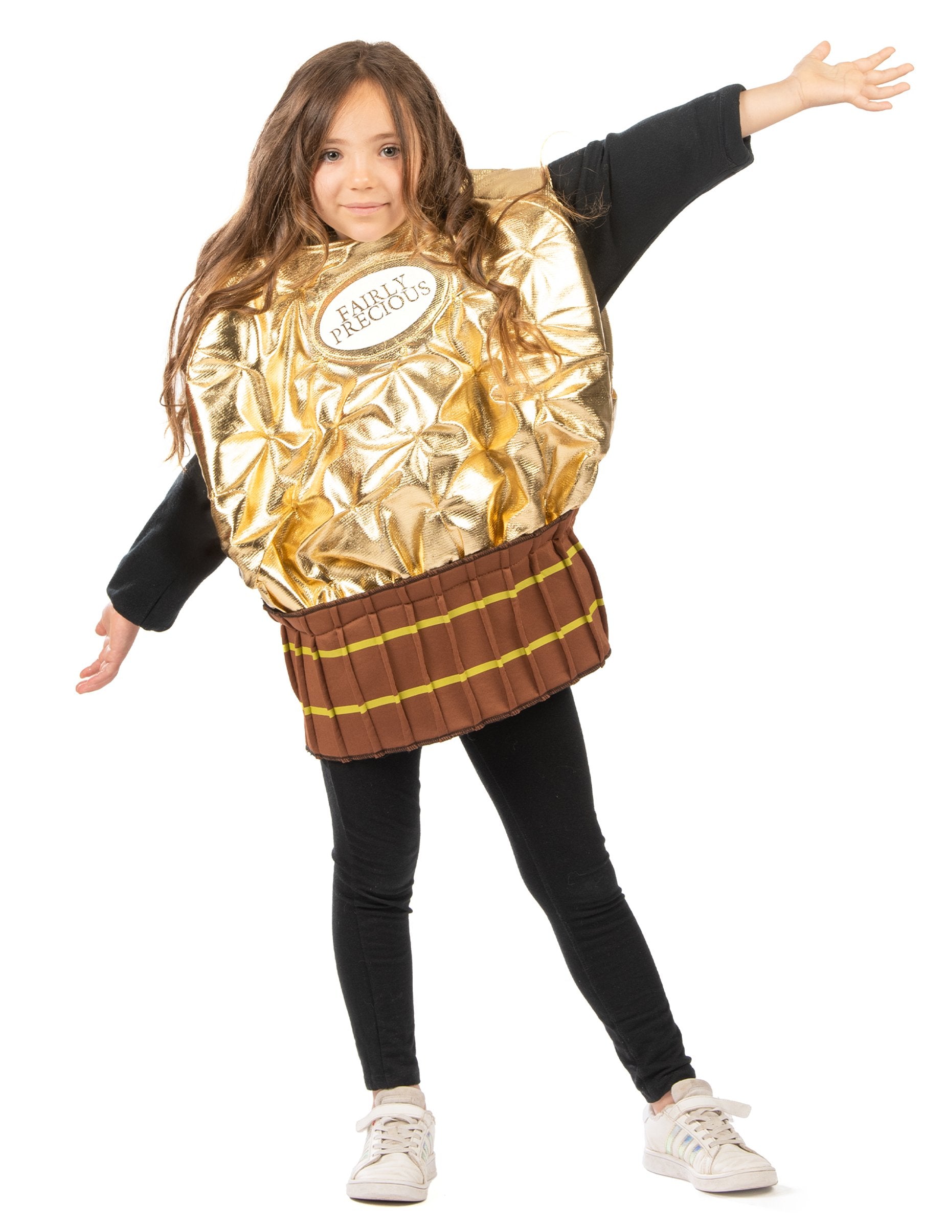 Ez az arany színű cukorka jelmez gyerekeknek egy egyedi overál, amely egy csillogó csokoládés csomag formáját idézi. A jelmez teteje fémes arany színű a káprázatos és ünnepi hatás érdekében. Az elejét egy központi kör díszíti a "Fairly Precious" felirattal. Az alsó része barna, két arany csíkkal a csábító megjelenés érdekében. A fej, a karok és a lábak számára kialakított kényelmes nyílásoknak köszönhetően a ruha könnyen felvehető felülről. Tökéletes jelmez, hogy ellenállhatatlan csokoládévá válj egy születésnapi bulin vagy karneválon!