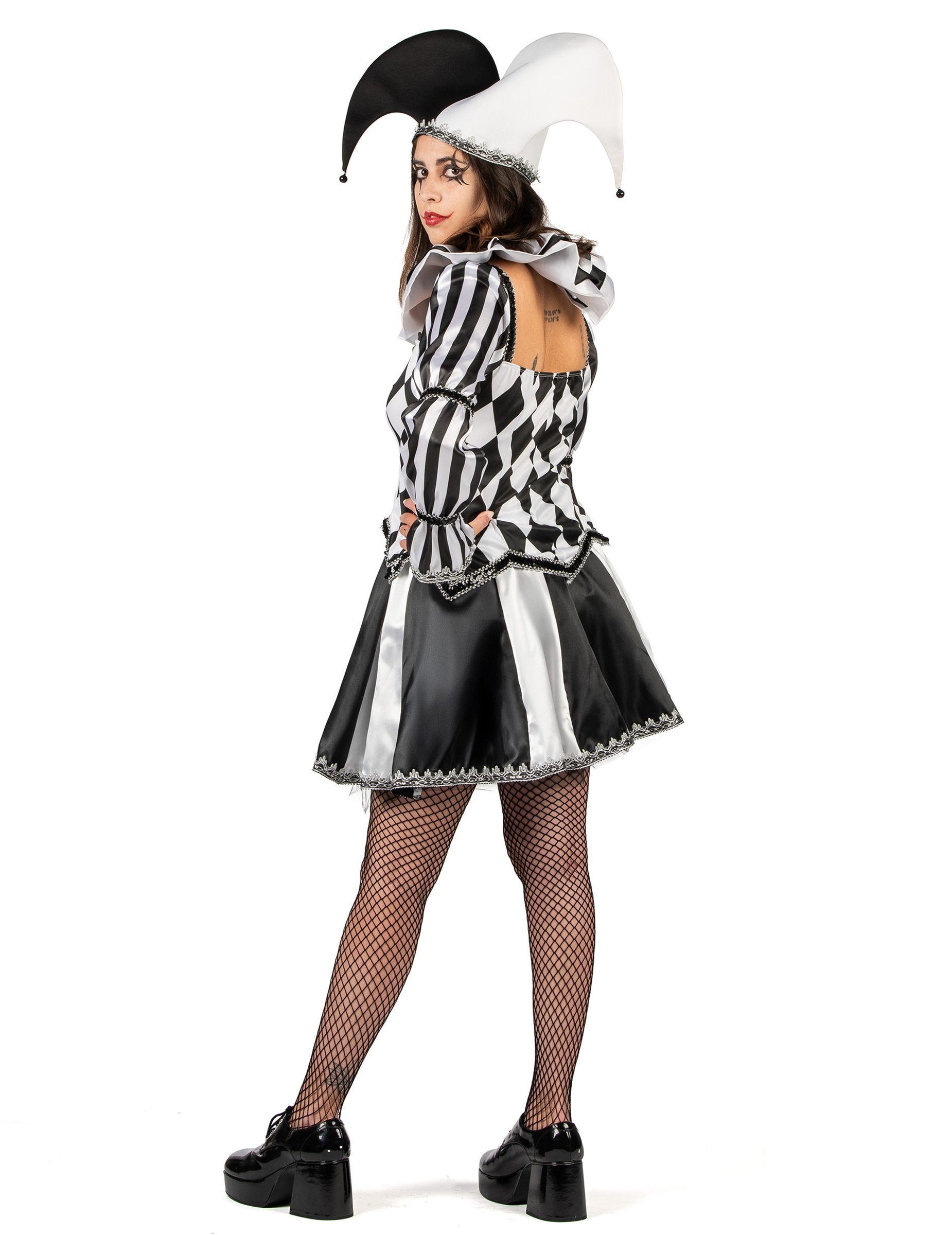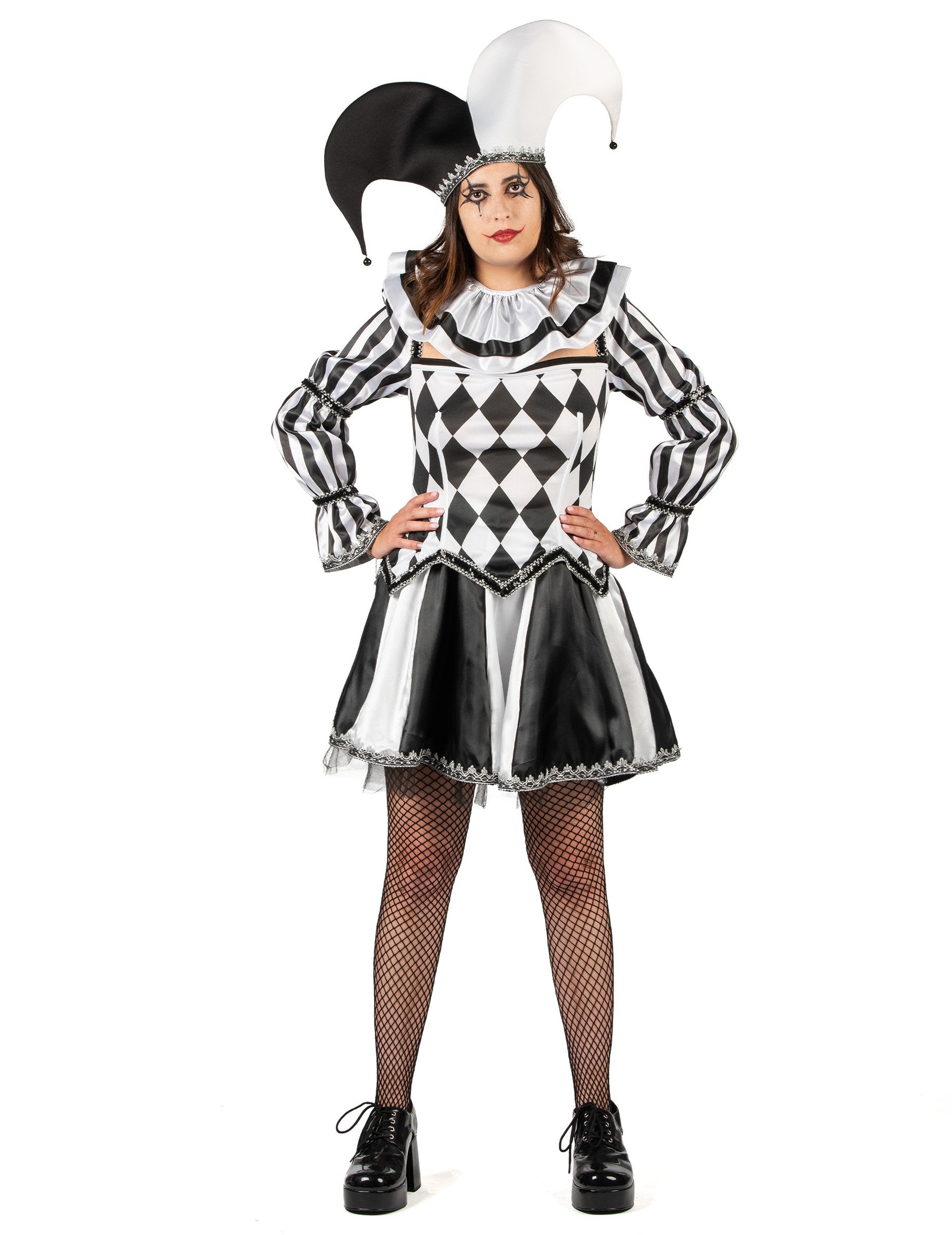 Ez a fekete-fehér, ördögi bohóc női jelmez minden tekintetet magára vonz grafikus mintáinak és selymes anyagainak keverékével. A karcsúsított felsőrész, amelyet rombuszok és függőleges csíkok díszítenek, kiemeli az alakot, miközben játékos eleganciát kölcsönöz. A kissé puffos, hosszú ujjakat fényes szegélyek hangsúlyozzák, így még karakteresebb a megjelenés. A rövid, fekete-fehér, lágy esésű szoknya alatt fekete tüll alsószoknya ad tartást és hangsúlyozza a bohóc hatást. A rakott gallér stílusosan keretezi a dekoltázst, míg a csengőkkel díszített sapka teljessé teszi ezt a pajkos és titokzatos karaktert. Ez a jelmez tökéletes választás egyedi és hátborzongató megjelenéshez Halloween alkalmából.