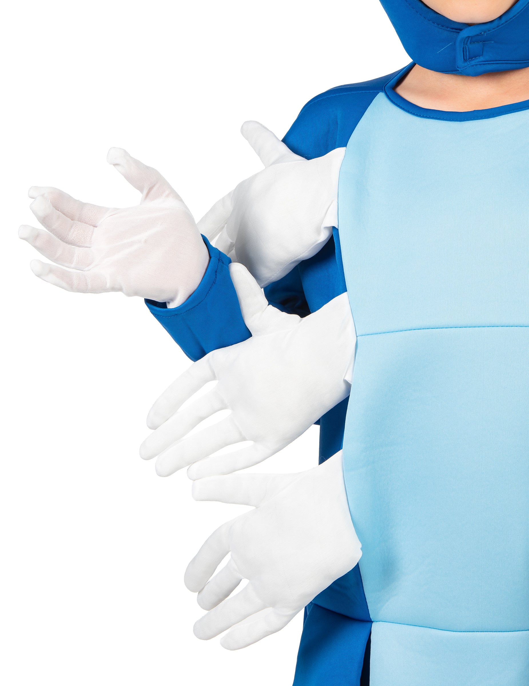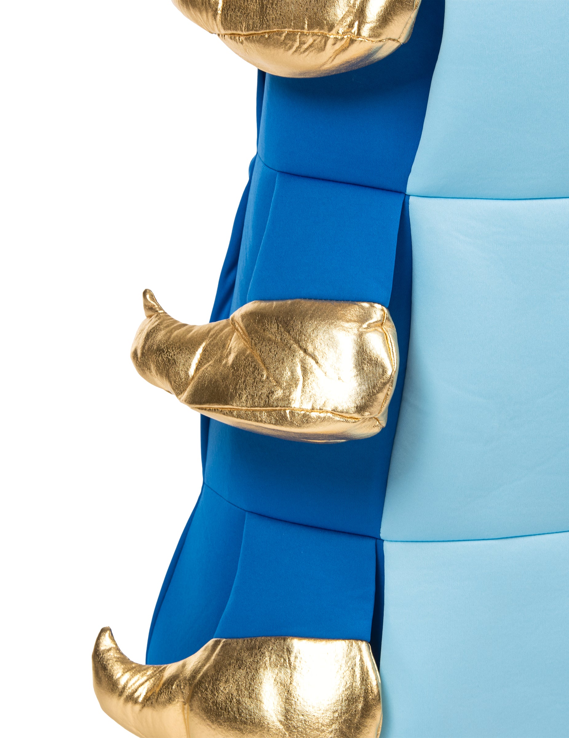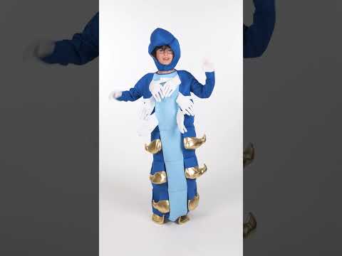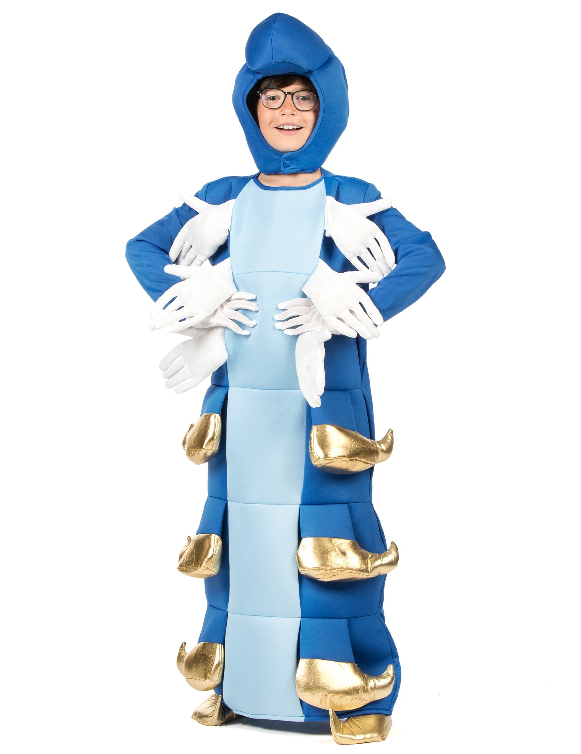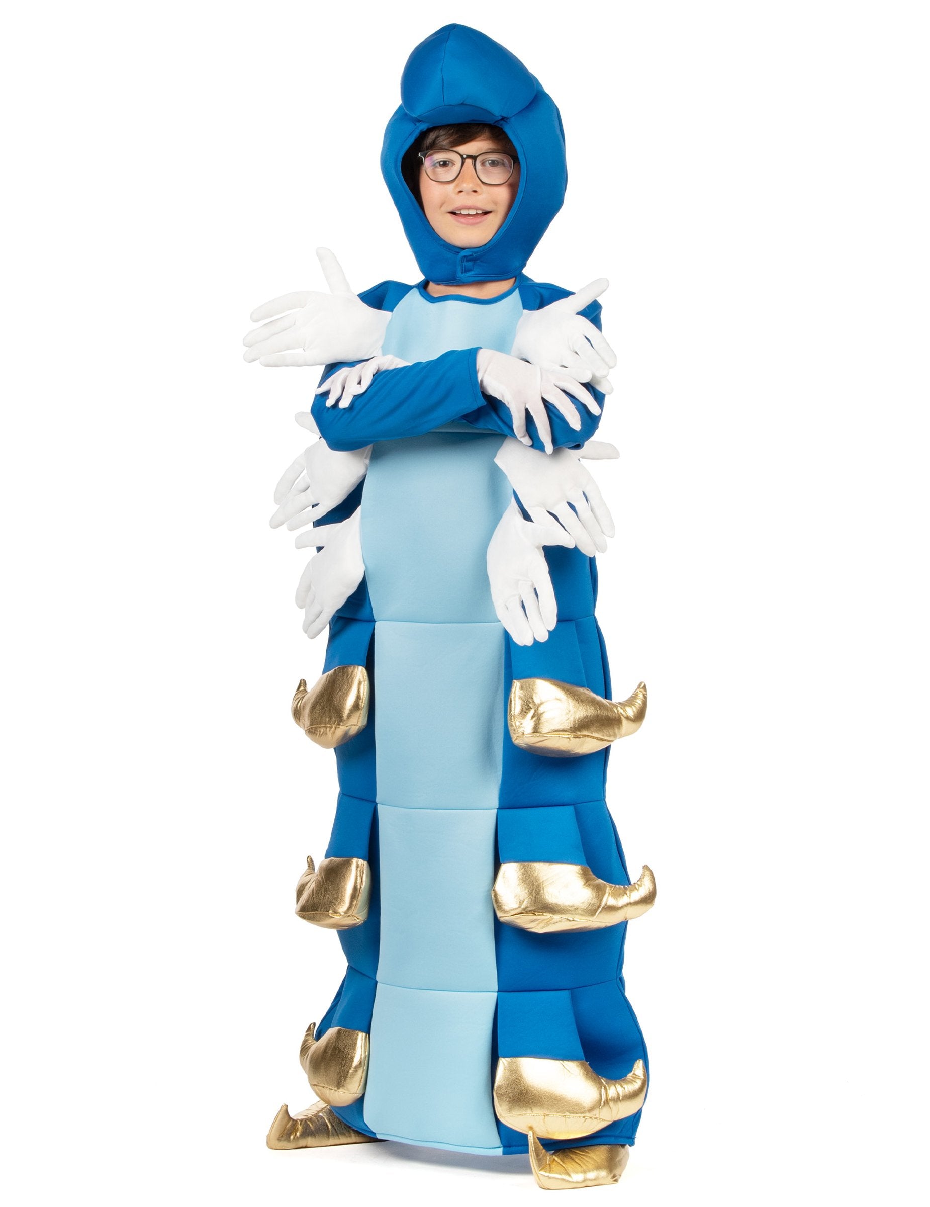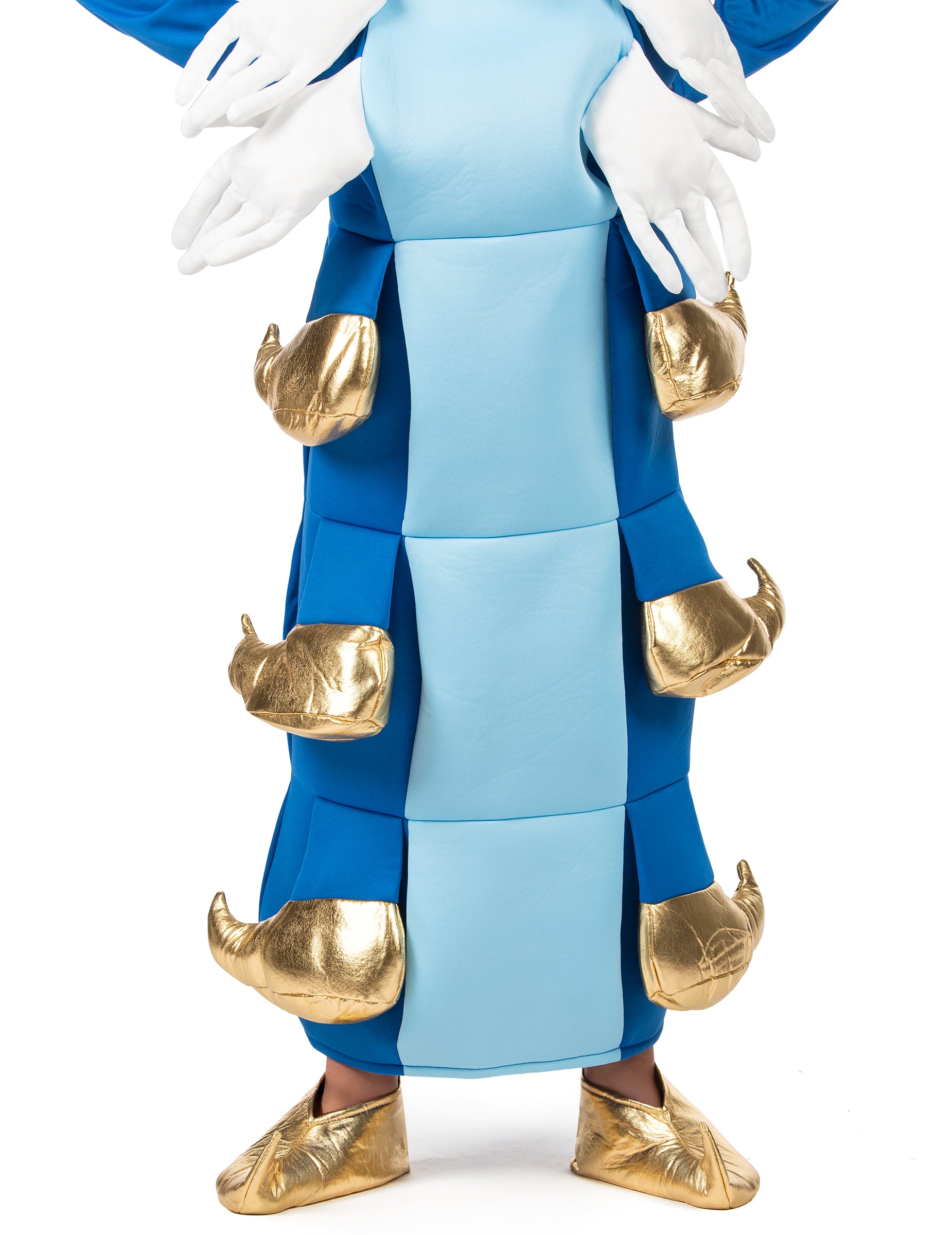 Ez a kék hernyó jelmez a gyermekek számára párnázott jumpsuitból, motorháztetőből, kesztyűkből és megfelelő cipőfedelekből áll. A kombináció, a Royal Blue és az Sky Blue kontrasztos színében, a hernyó megjelenését idézi elő. Fehér szövetkezeket és párnázott arany mancsokat varrnak az oldalán, a híres hernyó emlékeztetője egy csodálatos és szokatlan meseből. A kék motorháztető lekerekített alakú a sziluettet, a hernyó fejére emlékeztetve, az arc jól tiszta marad. A fehér kesztyű és az arany a teljes átalakulás megjelenését egyesíti. Kiválóan alkalmas karneválra, jelmezpartira vagy a fantasy mesék ihlette világhoz való csatlakozáshoz.