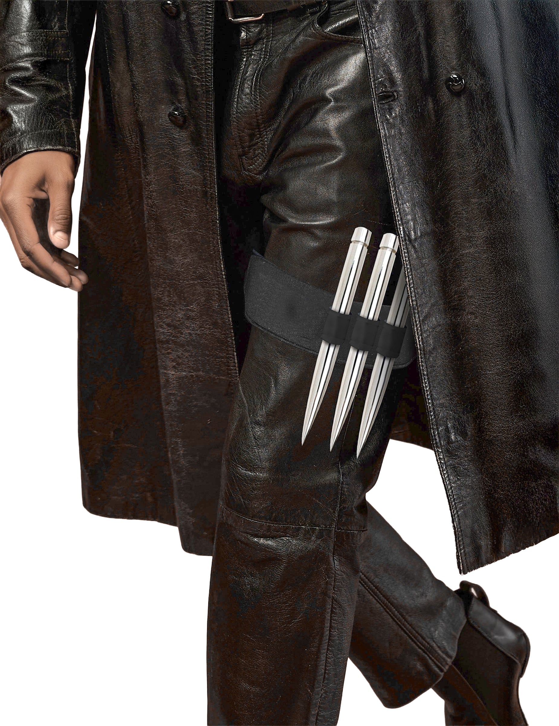 Ez a combpánt három ezüstszínű műkaróval van felszerelve, amelyeket egy fekete szíjra erősítettek, és a láb köré kell rögzíteni. Könnyen felvehető, valósághű és stílusos kiegészítője egy vadász vagy sötét harcos jelmezének. Tökéletes Halloween-i kosztümhöz, ez a kiegészítő erőteljes vizuális hatást kelt, mintha bármikor készen állna a használatra az éjszaka lényei ellen.