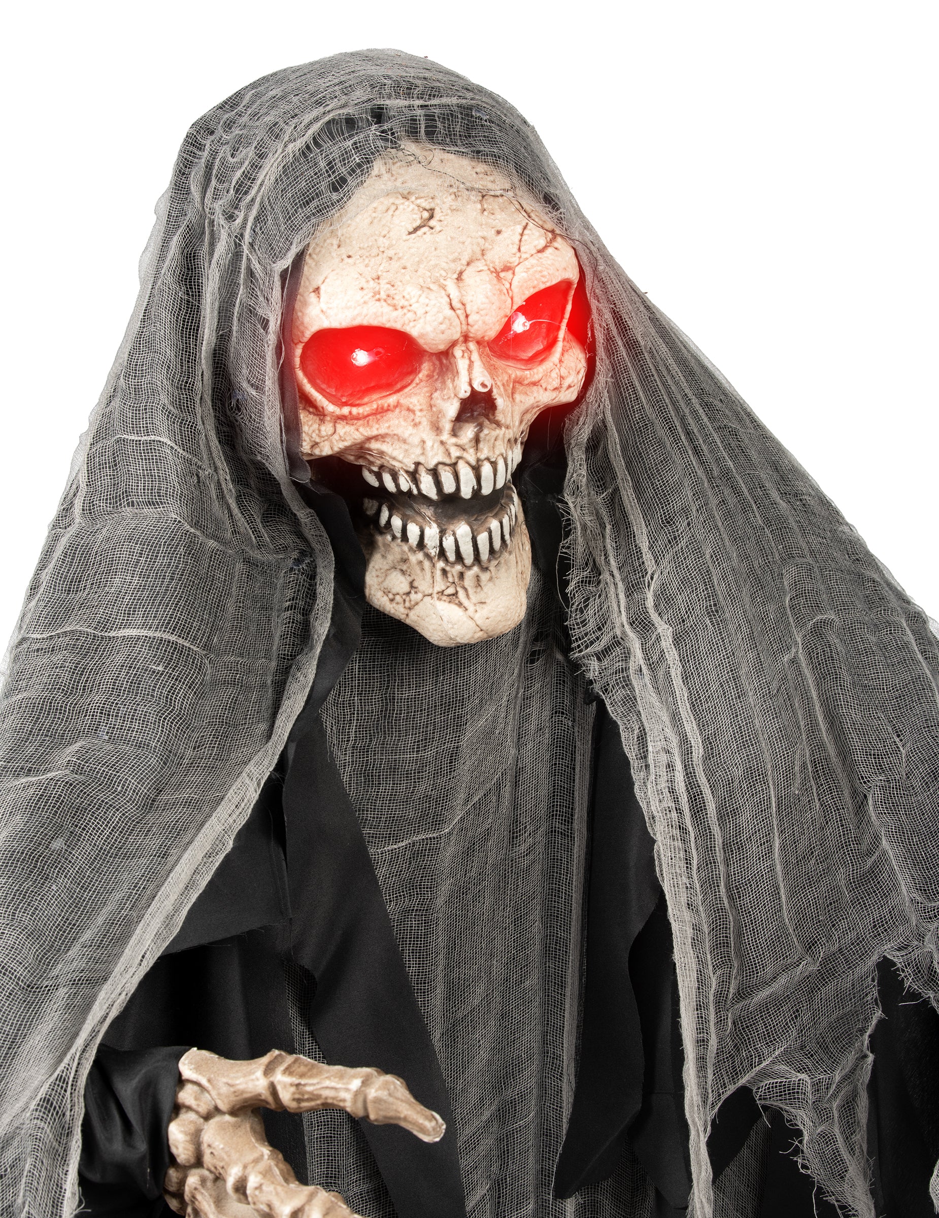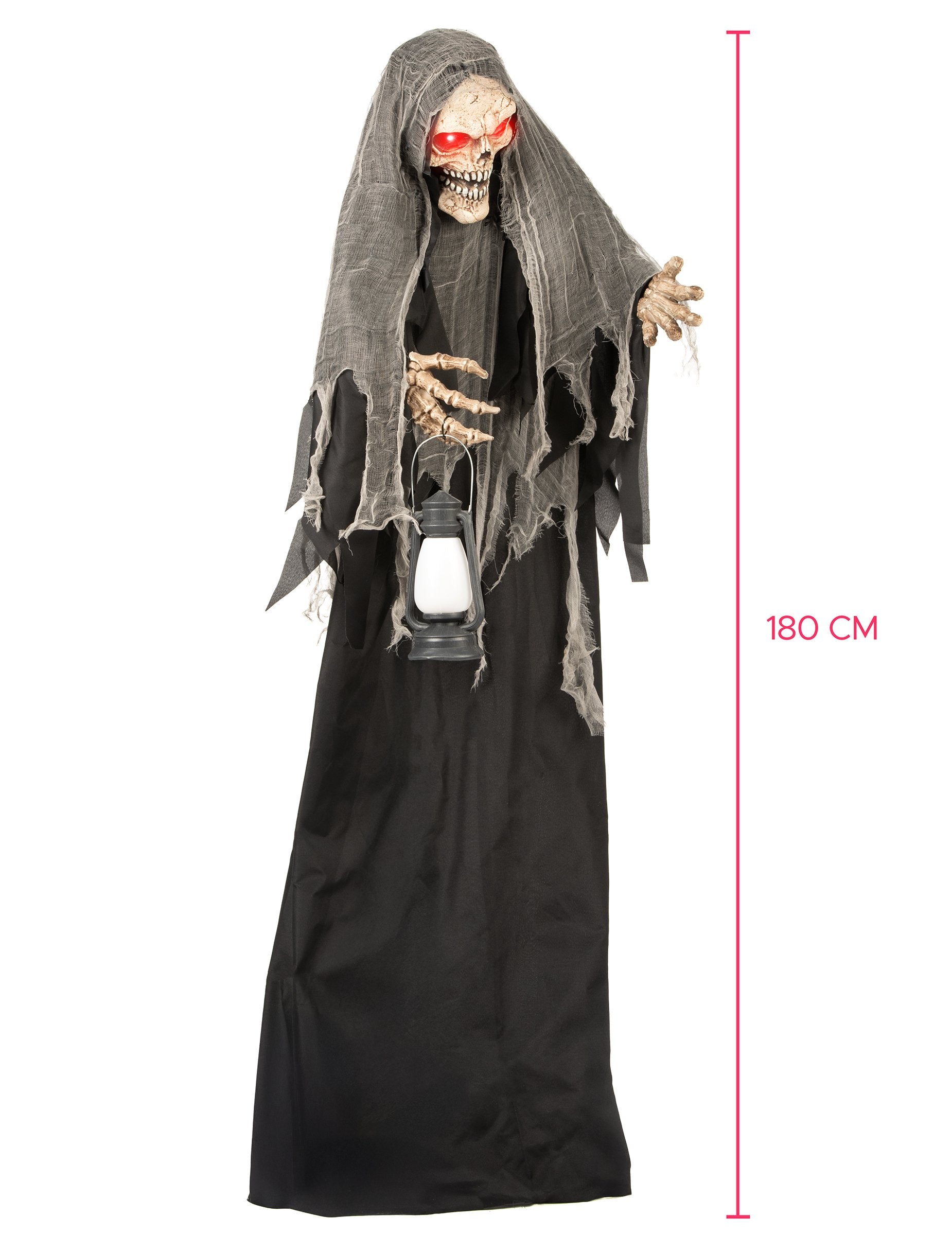 Vigye életre a legrosszabb eseteket ezzel a 180 ° -os animált Grim Reaperrel cm Körülbelül egy csontváz lény, amelyet feketébe borítottak, amely úgy tűnik, hogy az árnyékban vigyáz. Laza ruhája, szakadt fátyola és koponyája izzólámpa vörös pillantással olyan hatást hoz létre, amely olyan sötét, mint feltűnő. Amint egy hang hallatszik, a beépített érzékelő félelmetes sorozatot vált ki. A szeme felgyullad, gyászos hangokat bocsát ki, és fenyegető mozgásai aktiválódnak, hogy abszolút félelem légkörét hozzák létre. A dekoráció 3 AA akkumulátorral működik, amelyet nem tartoznak a hatások, a fény, a hang és az animáció hármasához. Tökéletes a Halloween, a kísértetjárta ház, a magával ragadó utazáshoz vagy a komor jelenethez, ez a ragyogó reaper valódi vizuális szorongássá válik a dekorációban.
