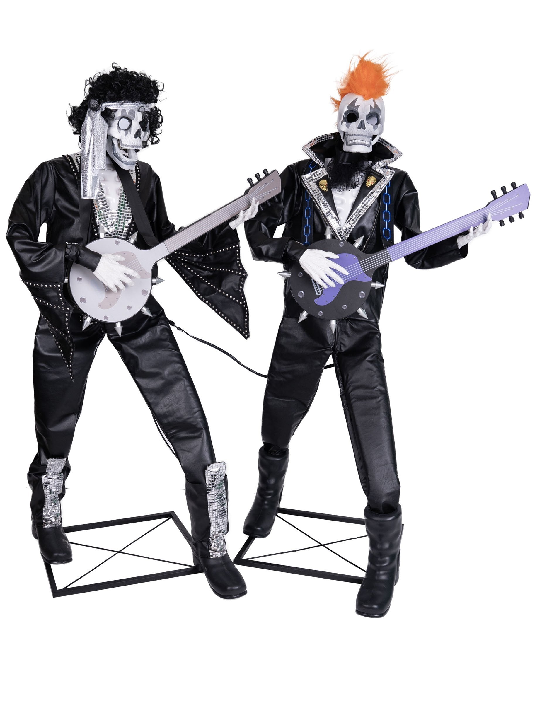 Cette décoration animée et sonore duo squelettes punk rock 185 cm transforme votre décor d’Halloween en véritable concert macabre. Mesurant 210 x 70 x 185 cm, ces deux squelettes musiciens s'imposent avec leurs tenues punk, leurs guitares électriques et leur look déjanté. Leurs yeux s’illuminent et s’animent tandis qu’ils chantent, jouent et se balancent au rythme d’un morceau infernal. La mâchoire du chanteur s’active à chaque phrase, renforçant l’effet réaliste et effrayant de la scène. L’ensemble est animé, sonore et lumineux, pour une immersion totale. Le duo fonctionne sur prise secteur AC 220-240V, idéal pour donner vie à vos ambiances musicales les plus lugubres lors de vos décors d’Halloween.