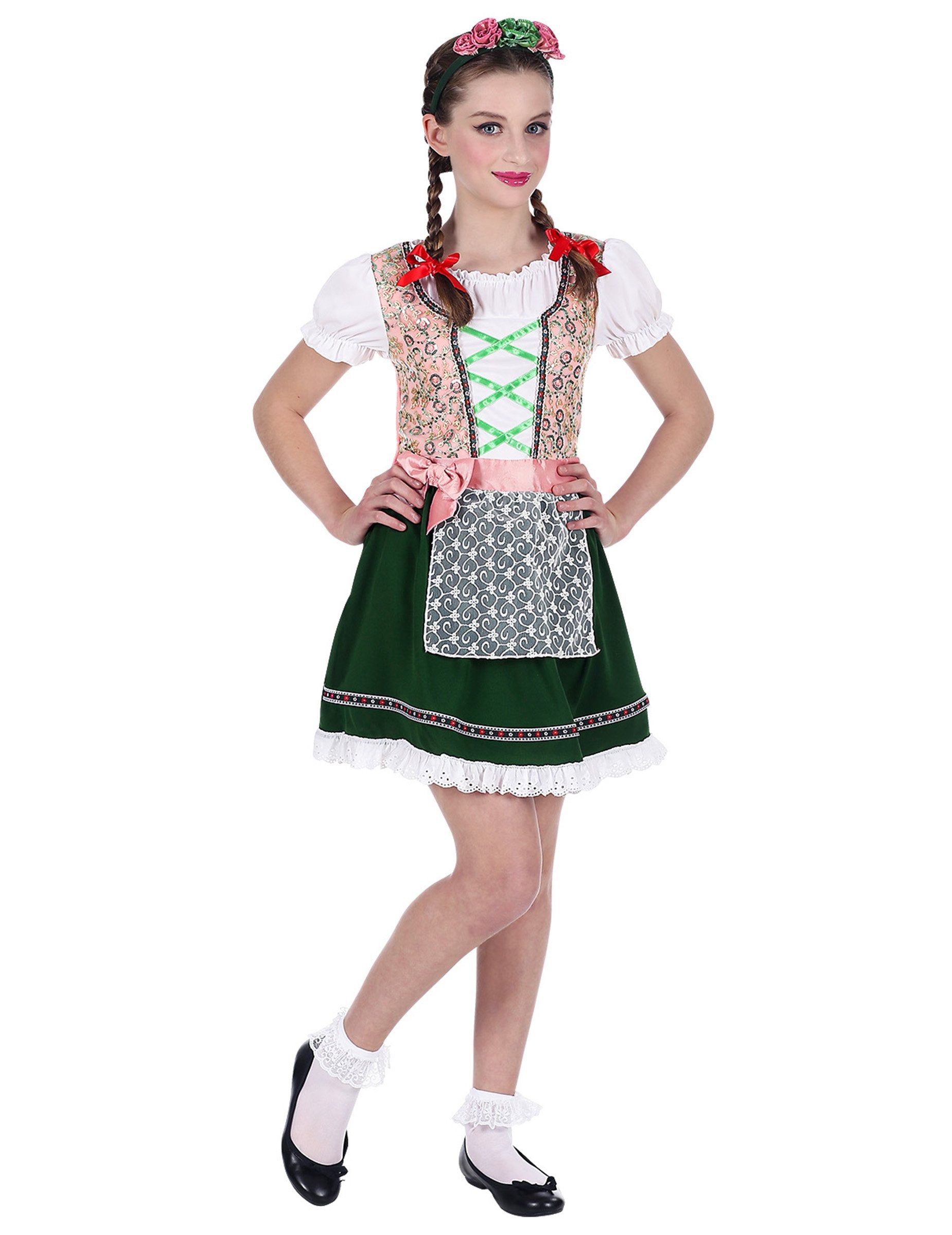 Ez a zöld-rózsaszín bajor lány jelmezgyerekeknek egy rózsaszín fűzős, zöld szalagos díszítésű ruhát, díszített zöld szoknyát, nyomott mintás kötényt, valamint egy virágos fejpántot tartalmaz, hogy teljessé tegye az öltözéket.