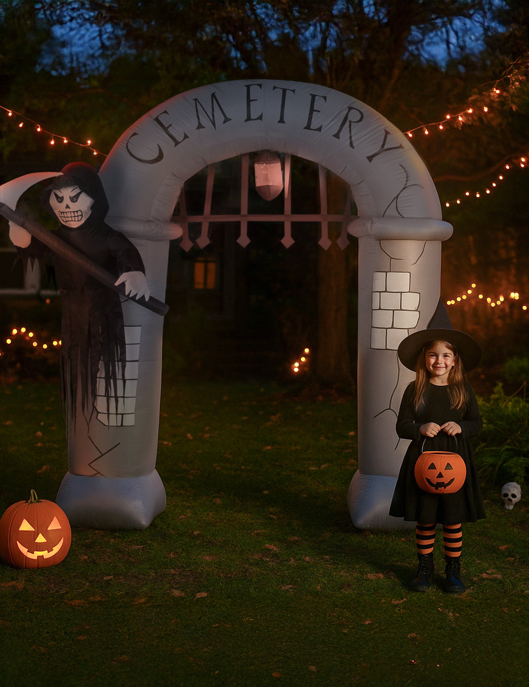 Créez une entrée impressionnante avec cette décoration gonflable en forme de portail de cimetière mesurant 2,40 m de haut. Avec son design lugubre, ses colonnes de pierres et sa faucheuse inquiétante, elle transforme votre jardin en un véritable décor d’horreur. Équipée de 5 LED intégrées, elle s’illumine à la tombée de la nuit pour un rendu encore plus effrayant. Fonctionnant sur secteur, elle est adaptée aussi bien pour un usage intérieur qu’extérieur. Facile à installer et à démonter, elle devient la pièce maîtresse de vos soirées d’Halloween.