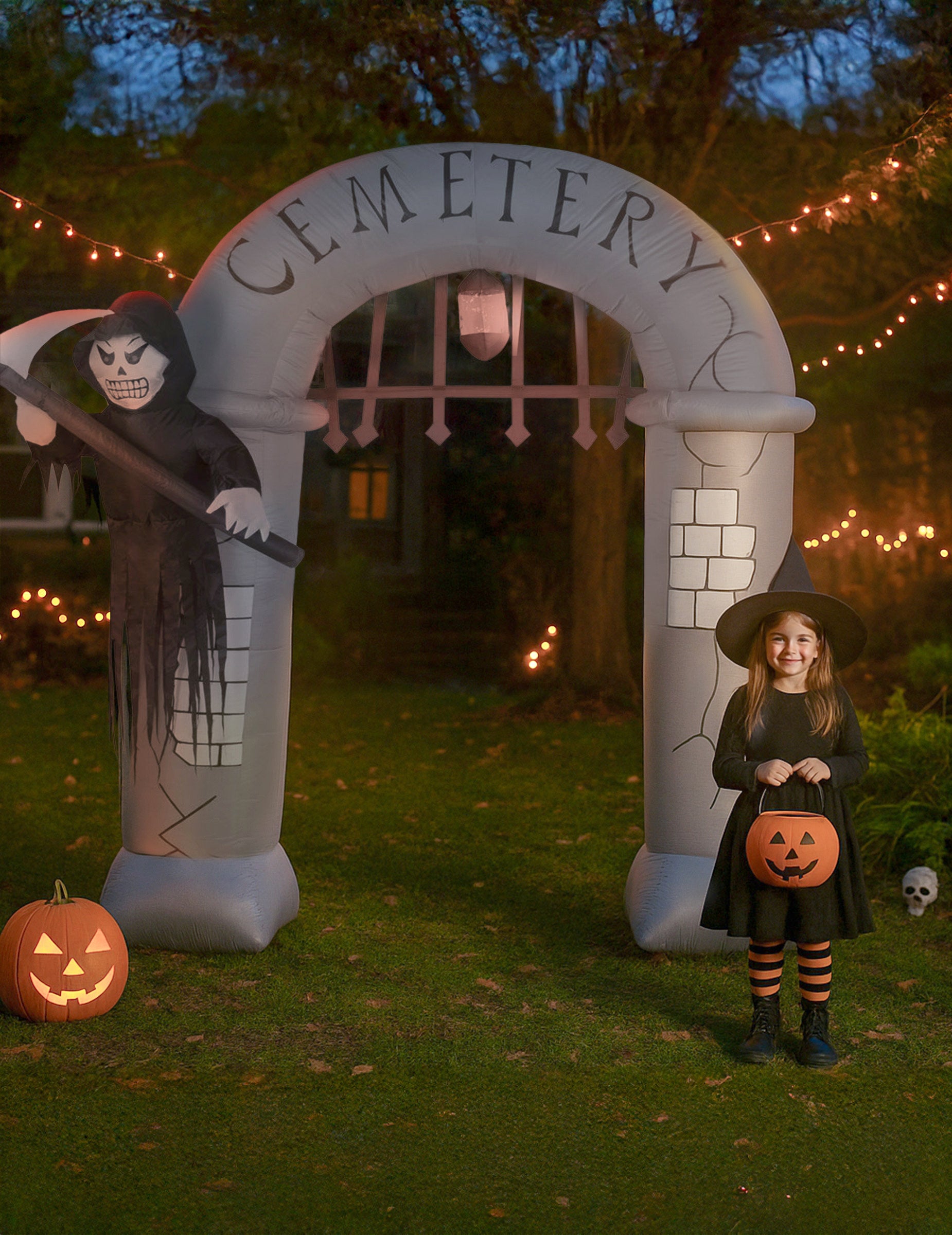 Hozzon létre egy lenyűgöző bejáratot ezzel a felfújható temető kapu dekorációval, amelynek mérete 2,40 m magas. Komor kialakításával, kőoszlopaival és zavaró reakciójával átalakítja a kertjét valódi horrorbeállítássá. 5 integrált LED -mel felszerelt, éjszaka világosabb megjelenés érdekében világít. A hálózaton működő, mind beltéri, mind kültéri használatra is alkalmas. Könnyen telepíthető és lebontható, ez a Halloween estéinek középpontjává válik.