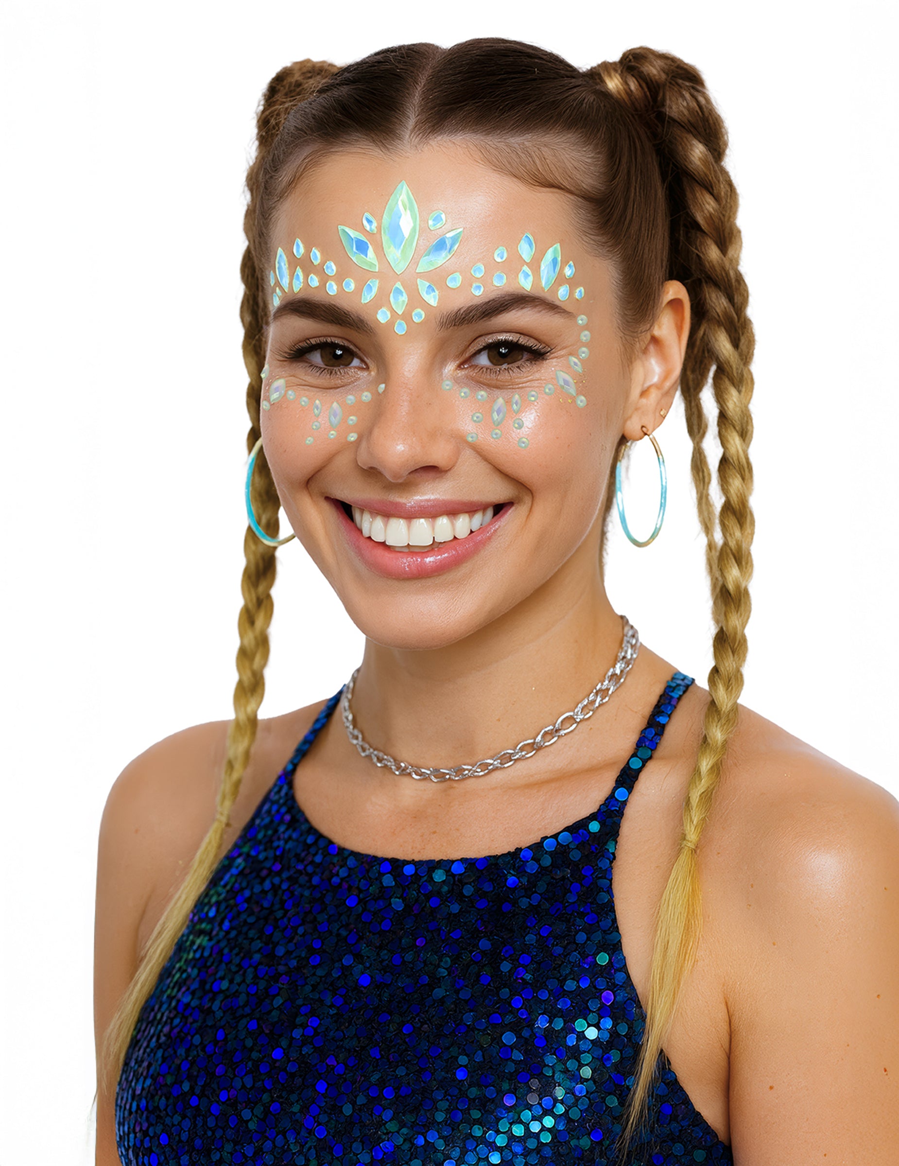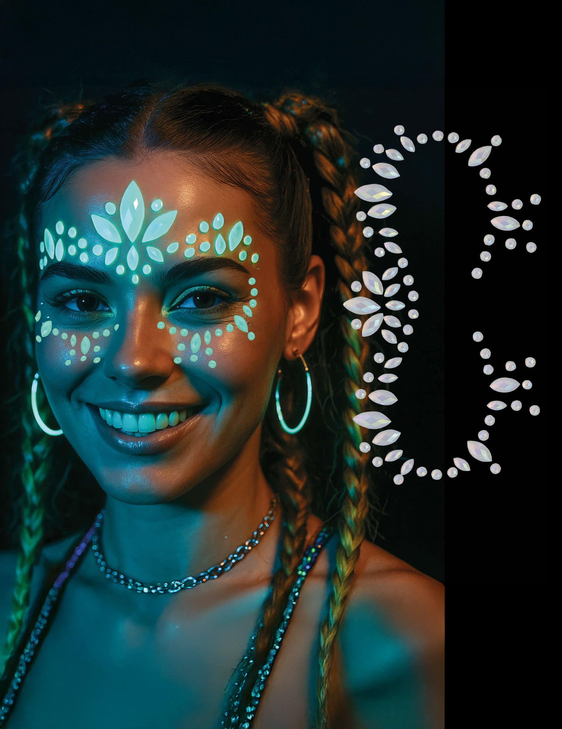 Ideálisak fesztiválra, neon bulira, farsangra vagy Halloweenre, ezek az öntapadós ékszerek tökéletes kiegészítői az egyedi party sminkeknek.