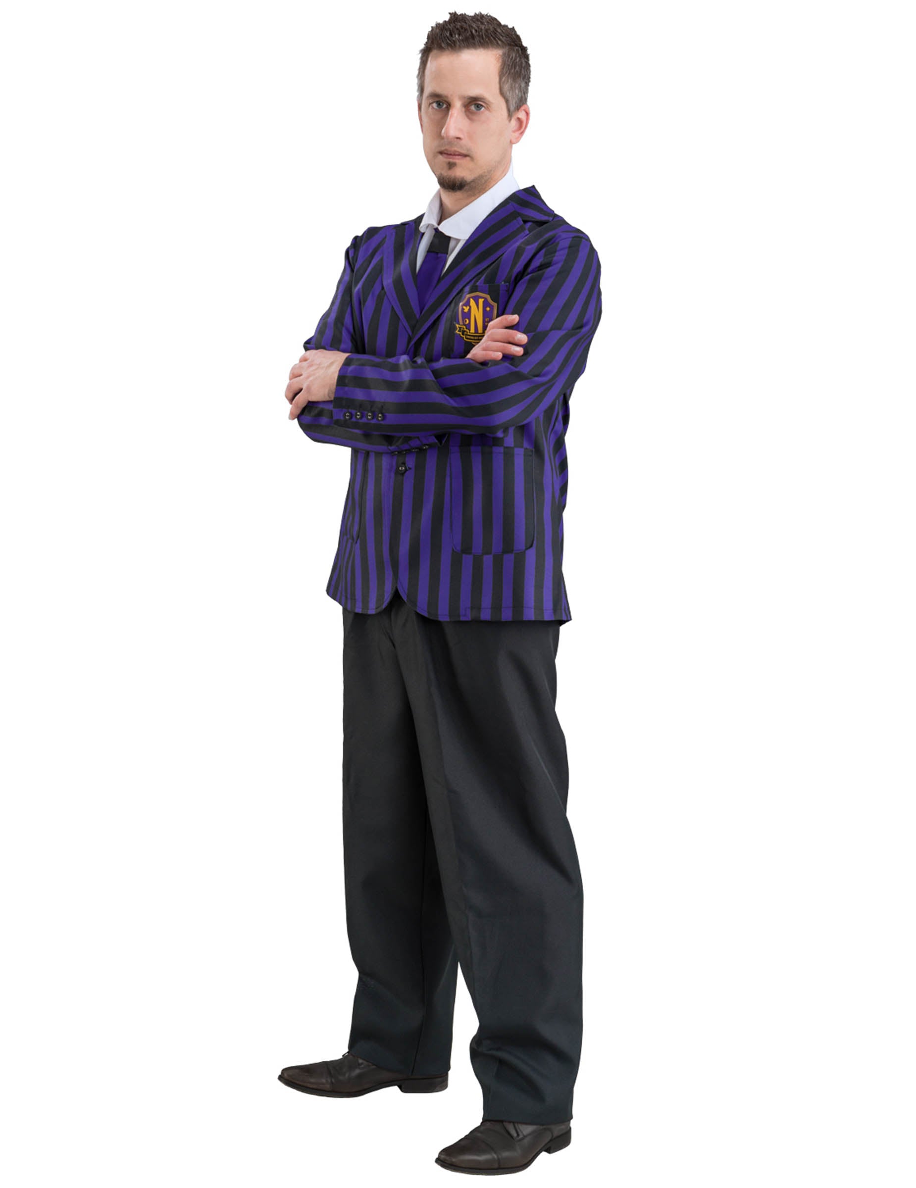 Merülj el a nagy sikerű Wednesday™ sorozat világában ezzel a férfi iskolai egyenruha jelmezzel. A jelmez tartalmaz egy lila-fekete csíkos zakót az akadémia címerével, egy inggel és nyakkendővel ellátott mellényt, valamint egy hozzáillő nadrágot. Elegáns és azonnal felismerhető, így könnyedén belebújhatsz a titokzatos Nevermore Akadémia diákjának szerepébe.