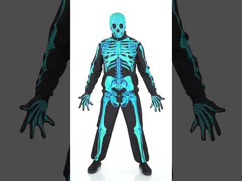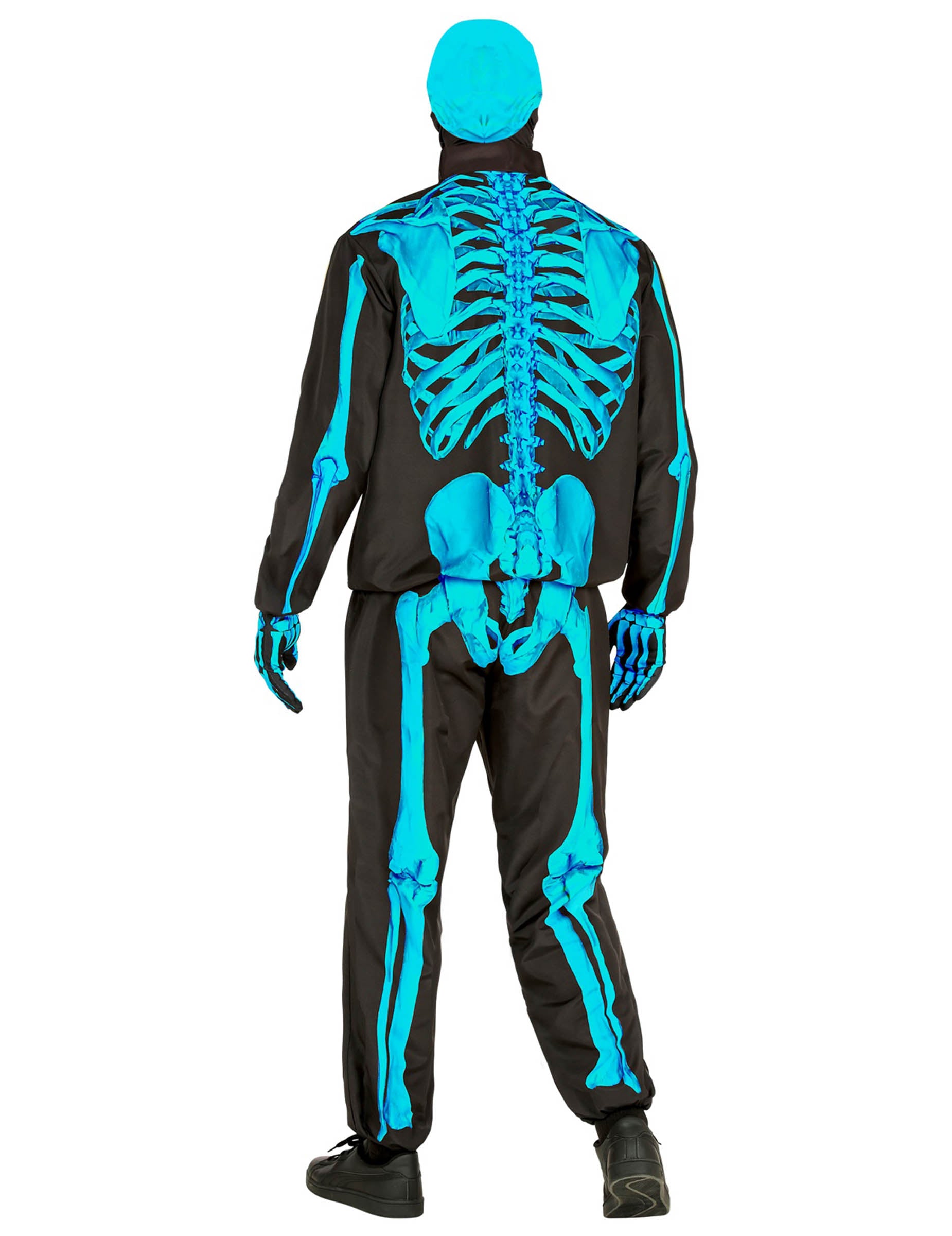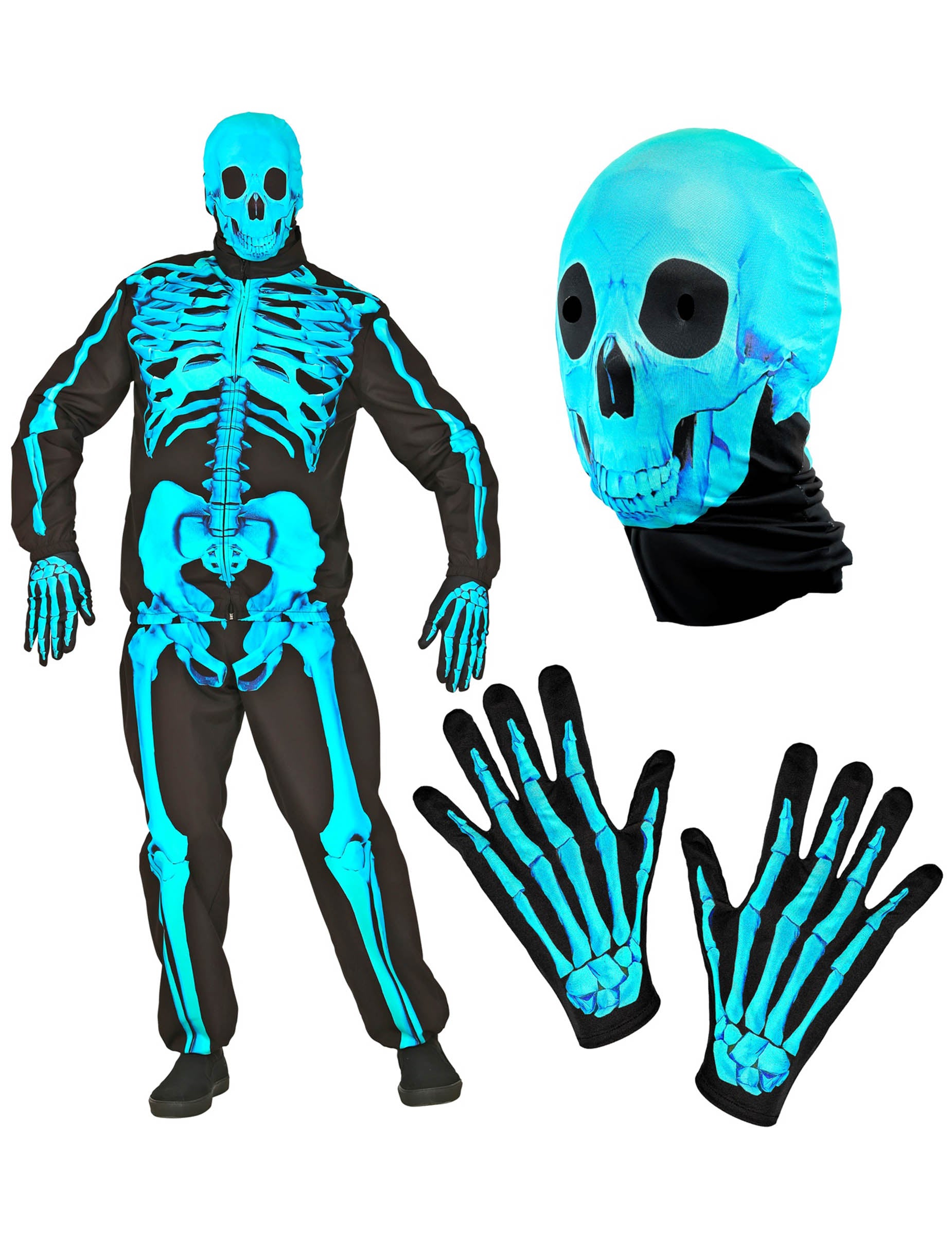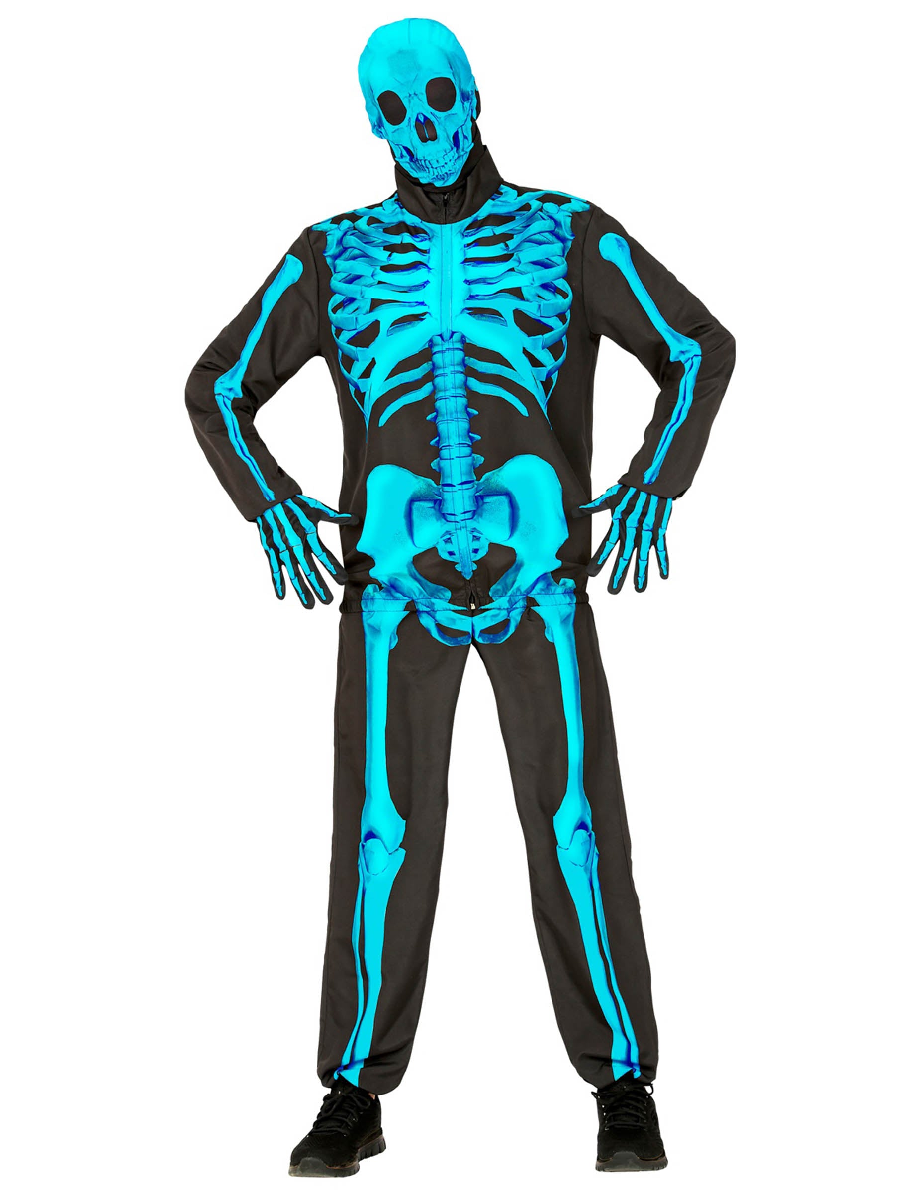 Ezzel a fluoreszkáló kék csontváz teljes jelmezzel garantáltan lenyűgözöd barátaidat a tematikus bulikon. A szett tartalmaz egy zakót, nadrágot, kesztyűt és egy maszkot, mindegyik fluoreszkáló mintás, nyomott anyagból készült.