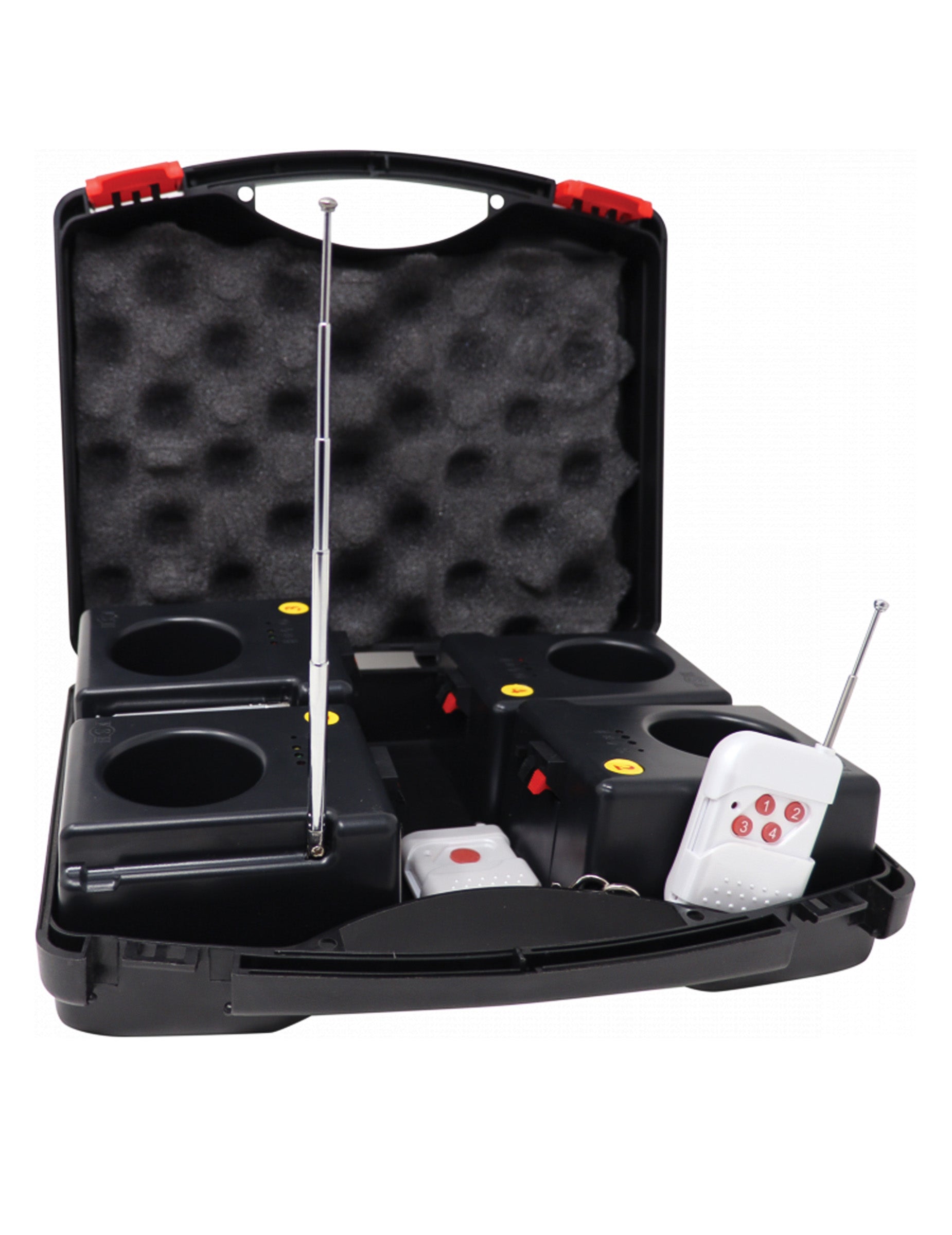 Ez a távirányítós indítóegység 4 tartót tartalmaz színpadi füst- vagy szikraszórókhoz, és lehetővé teszi, hogy pirotechnikai effektjeit szinkronizáltan és biztonságosan indítsa el. Kompakt és könnyen szállítható, egy tárolóbőrönd formájában érkezik, amely négy különálló tartót rejt, melyeket az Ön által kívánt elrendezés szerint külön-külön lehet elhelyezni.