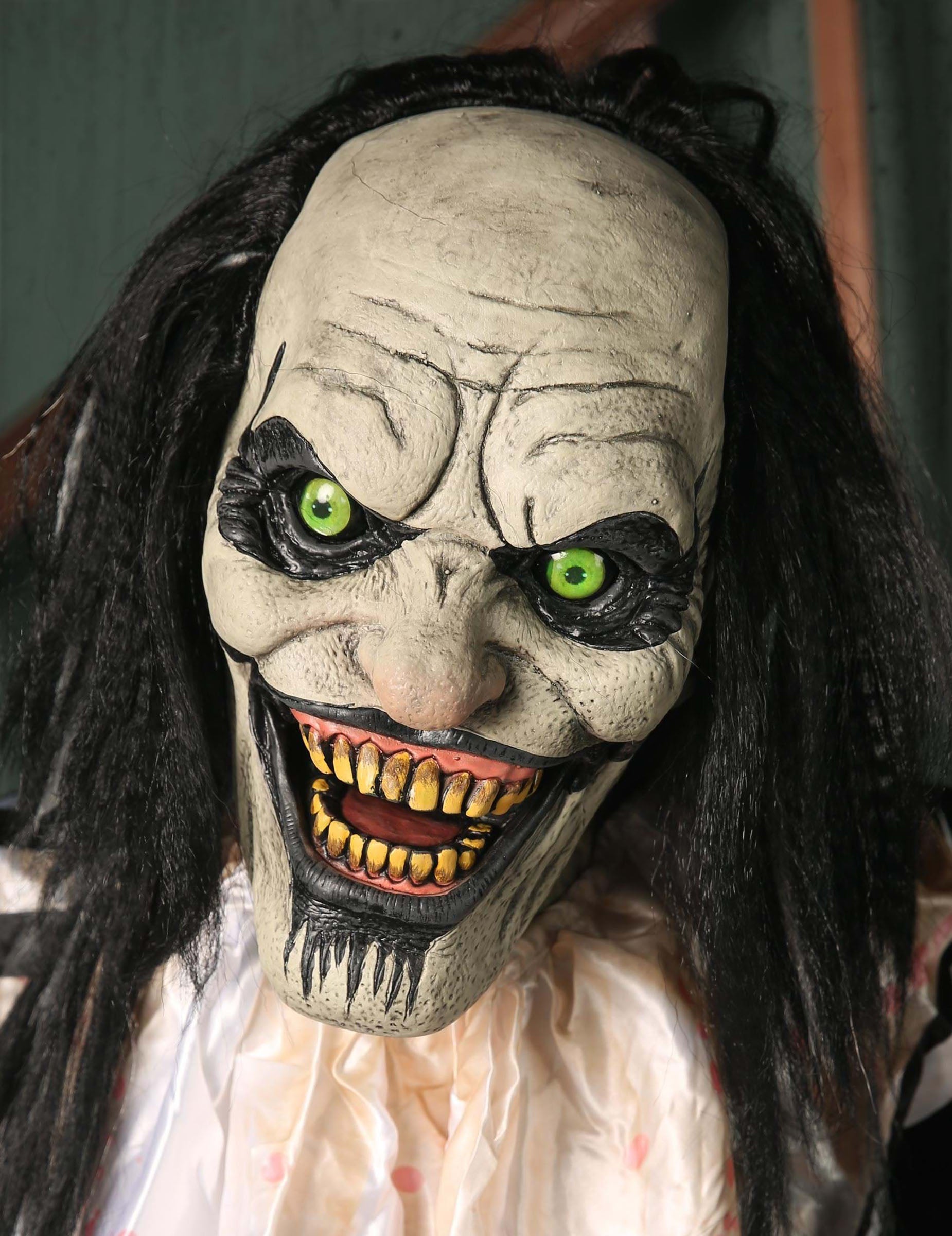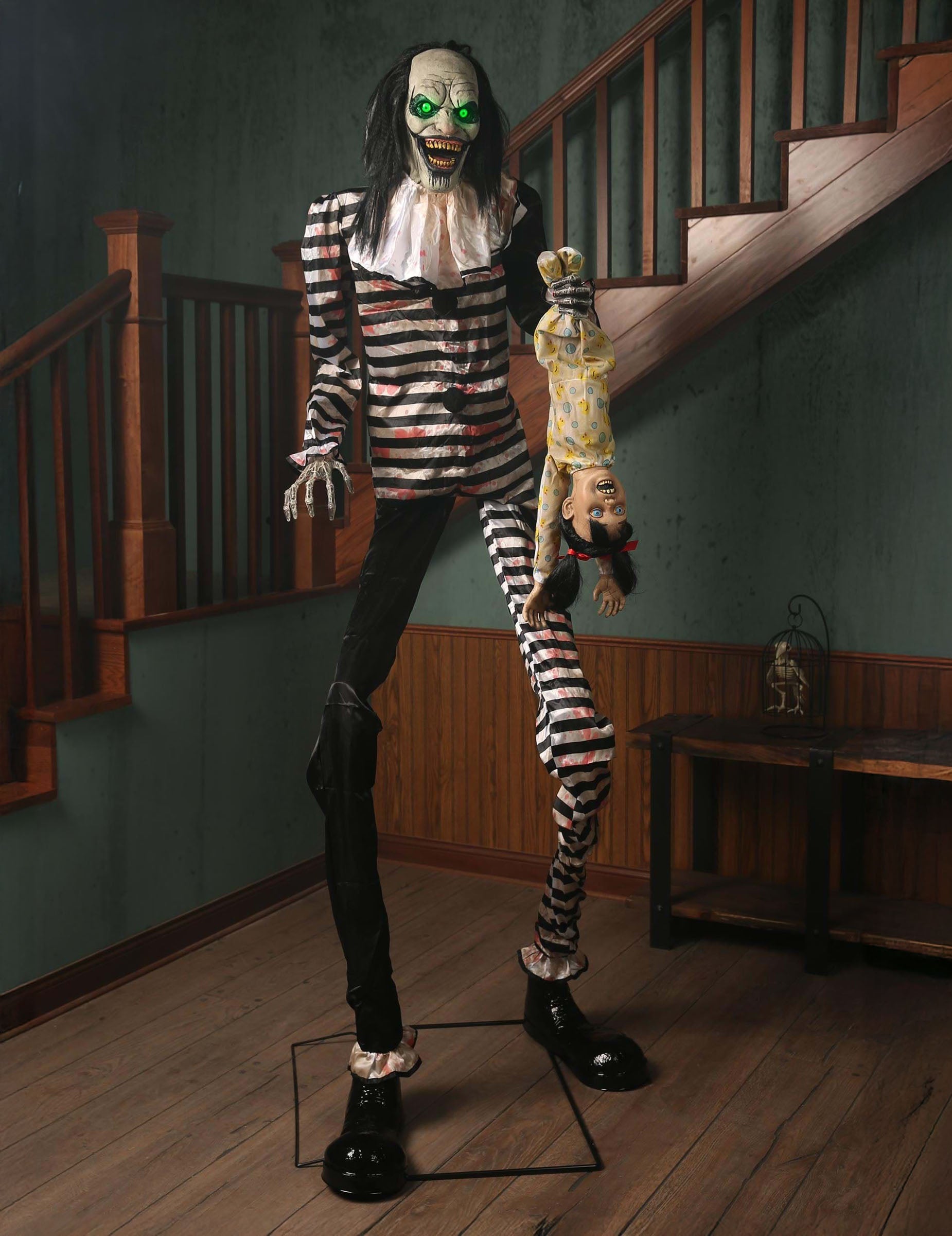 Ez a félelmetes 2,15 méteres animációs bohóc az egyik leginkább zavaró dekoráció az emlékezetes Halloween jelenethez. Világító pillantásával, mozgó állkapcsa és gonosz vigyorával azonnal beállítja a hangot. Az ábra oldalra mozog, és egy gyermekbabát felfüggesztett, amelyet a lábai felfüggesztenek, ami minden mozgással sikoltozik. A bohóc jelmeze és az áldozat kifejezése közötti kontraszt olyan légkört teremt, amely egyaránt hátborzongató és látványos. Az animációt egy infravörös érzékelőnek köszönhetően automatikusan indítják el, és a hangmennyiség beállítható, hogy alkalmazkodjon a dekorációhoz. Az egész este folyamatos hatás érdekében működik a hálózaton.