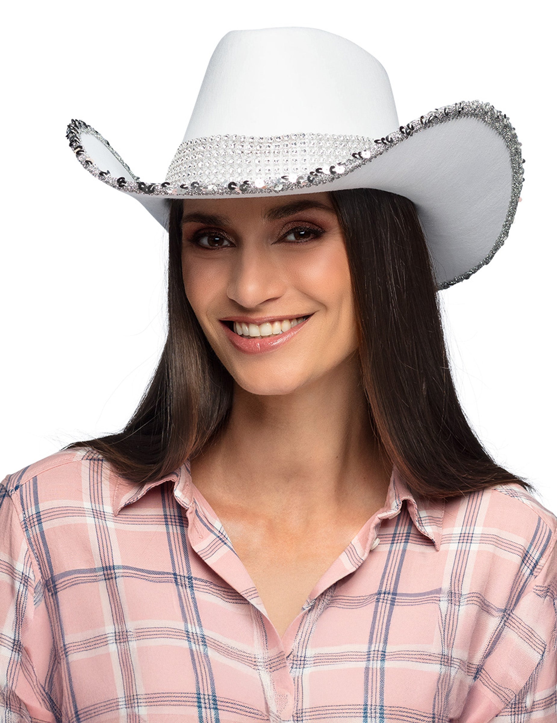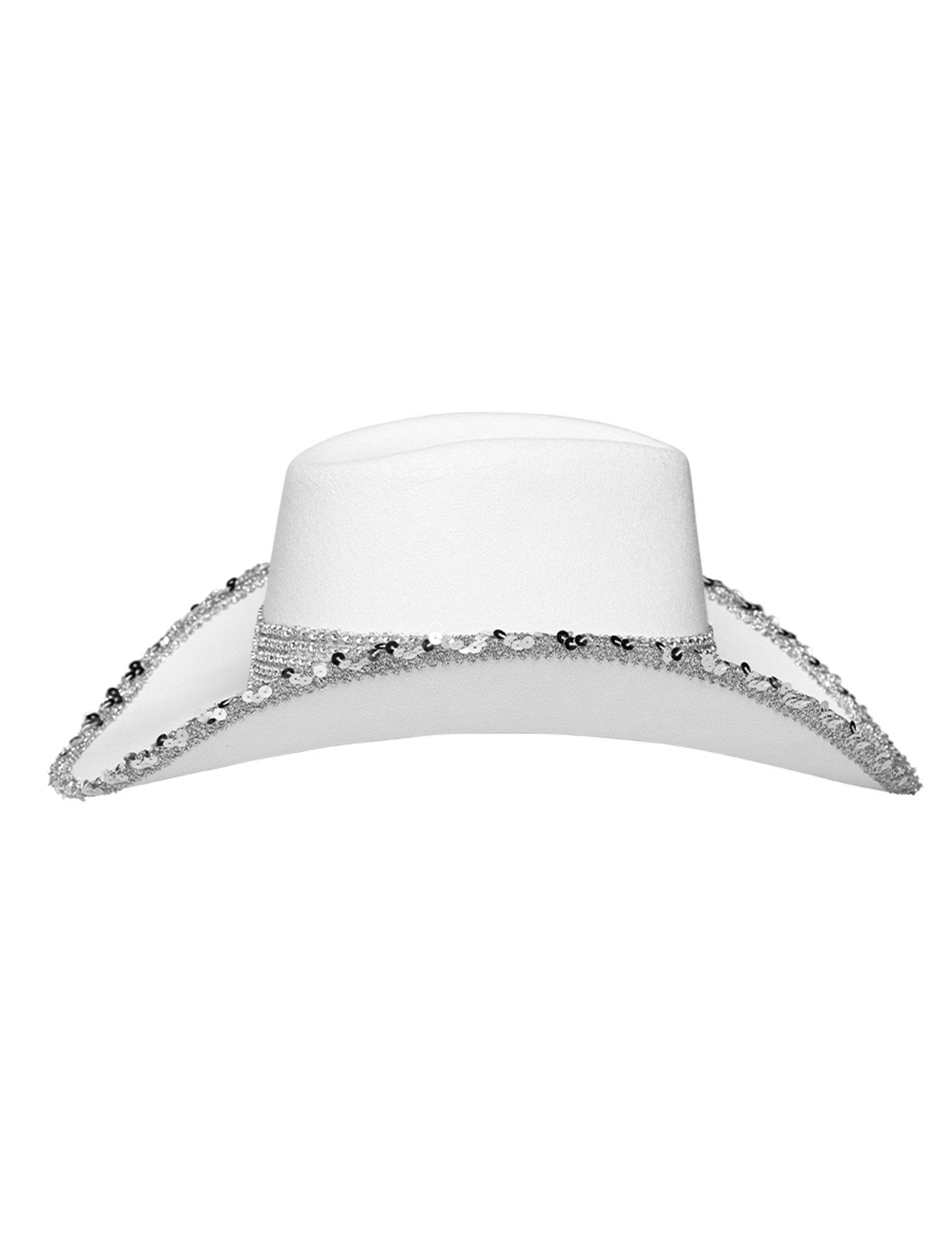 Ez a fehér cowboykalap felnőtteknek tökéletes egy elbűvölő leánybúcsúra, egy divatos fesztiválra vagy egy egyedi jelmezbálra. Világító velúrhatása, csillogó strassz szalagja és ezüsttel szegélyezett karimája elegáns és ünnepi darabdá teszi. Tökéletesen kiegészíti a modern cowgirl öltözéket, legyen szó leánybúcsúról, karneválról, szilveszterről vagy bármilyen western témájú eseményről.